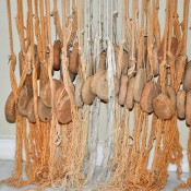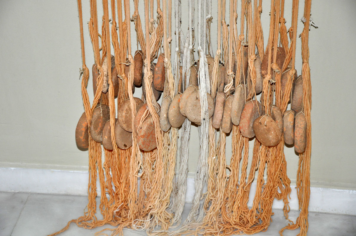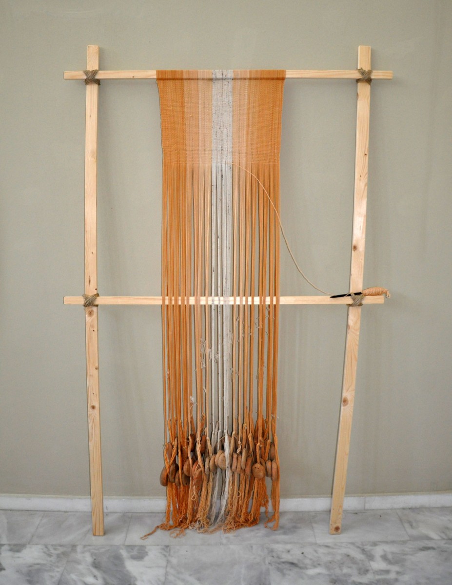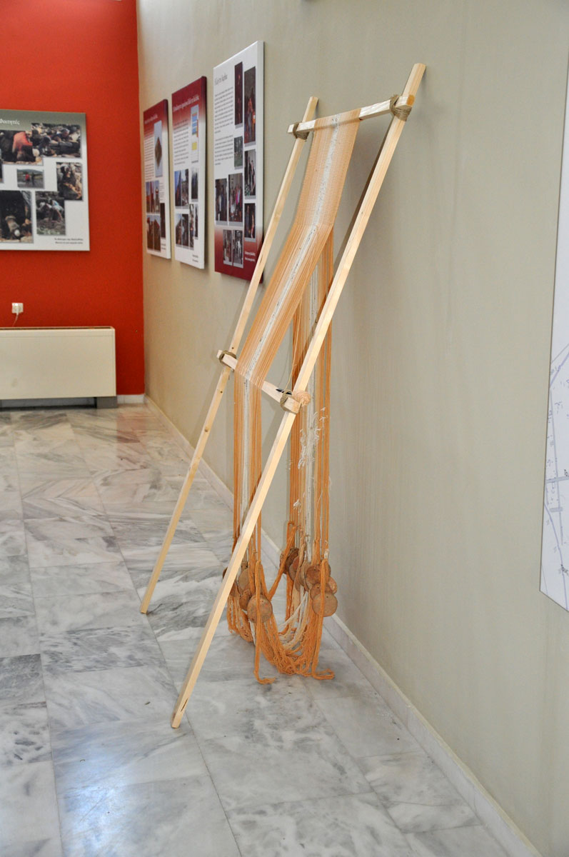 Σύμφωνα με την επιμελήτρια της έκθεσης Βάσω Νούλα: «Πρόκειται για την αναπαράσταση ενός κάθετου αργαλειού της Ελληνιστικής Εποχής με υφαντικά βάρη (αγνύθες), στην οποία χρησιμοποιήθηκαν σαράντα αυθεντικές αρχαίες πήλινες αγνύθες που βρέθηκαν στο Κτήριο 10 του Κάστρου της Καλλιθέας, διαταγμένες σε δύο σειρές.