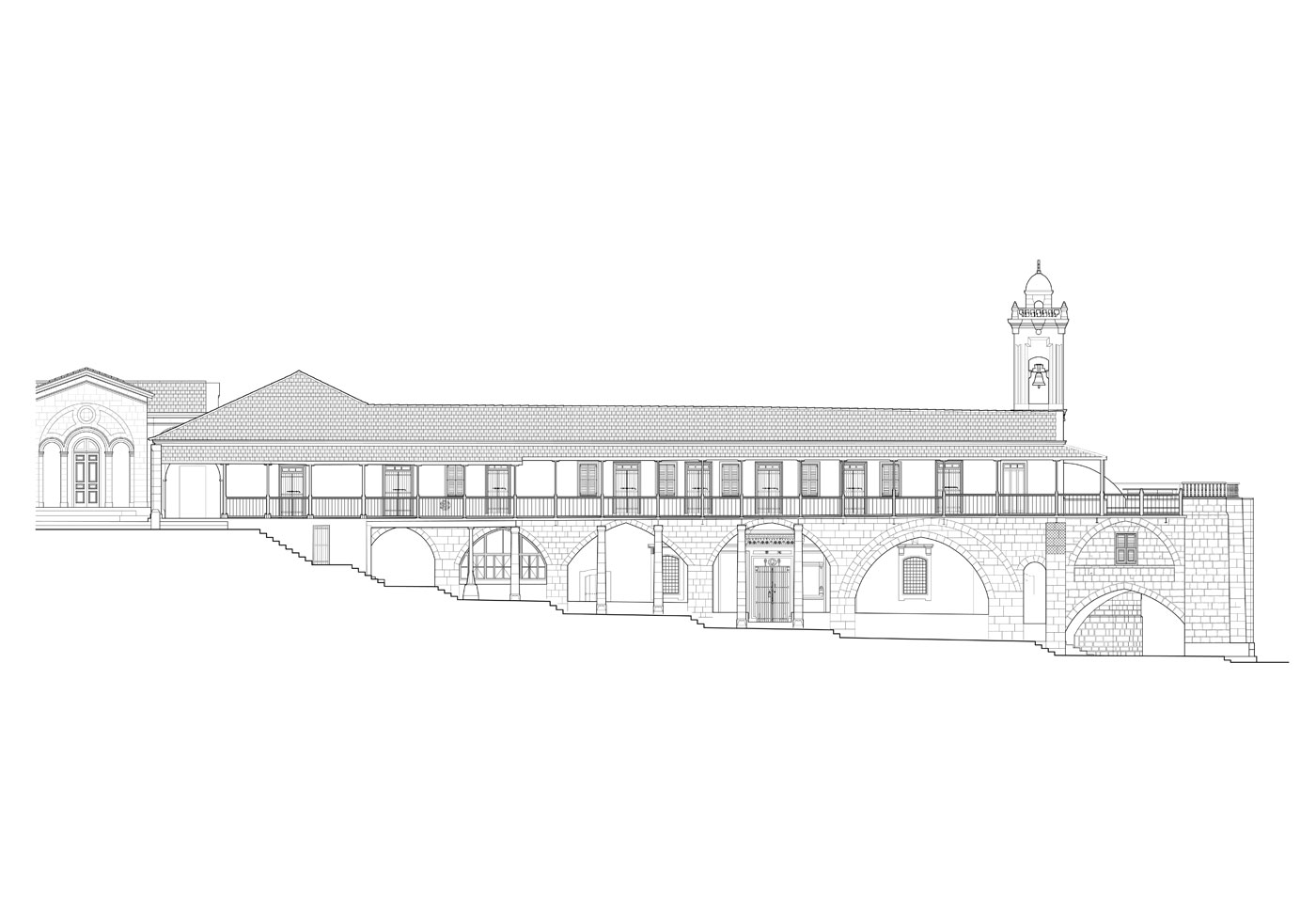 5. Κελιά ορόφου νότιας πτέρυγας. Επισκευή (αντικατάσταση θυρών παραθύρων στέγης, κιγκλιδώματα, μπαλκόνι κ.λπ.). Διαμόρφωση τμήματος σε παρεκκλήσιο, διαμόρφωση τμήματος σε μουσείο κ.λπ.