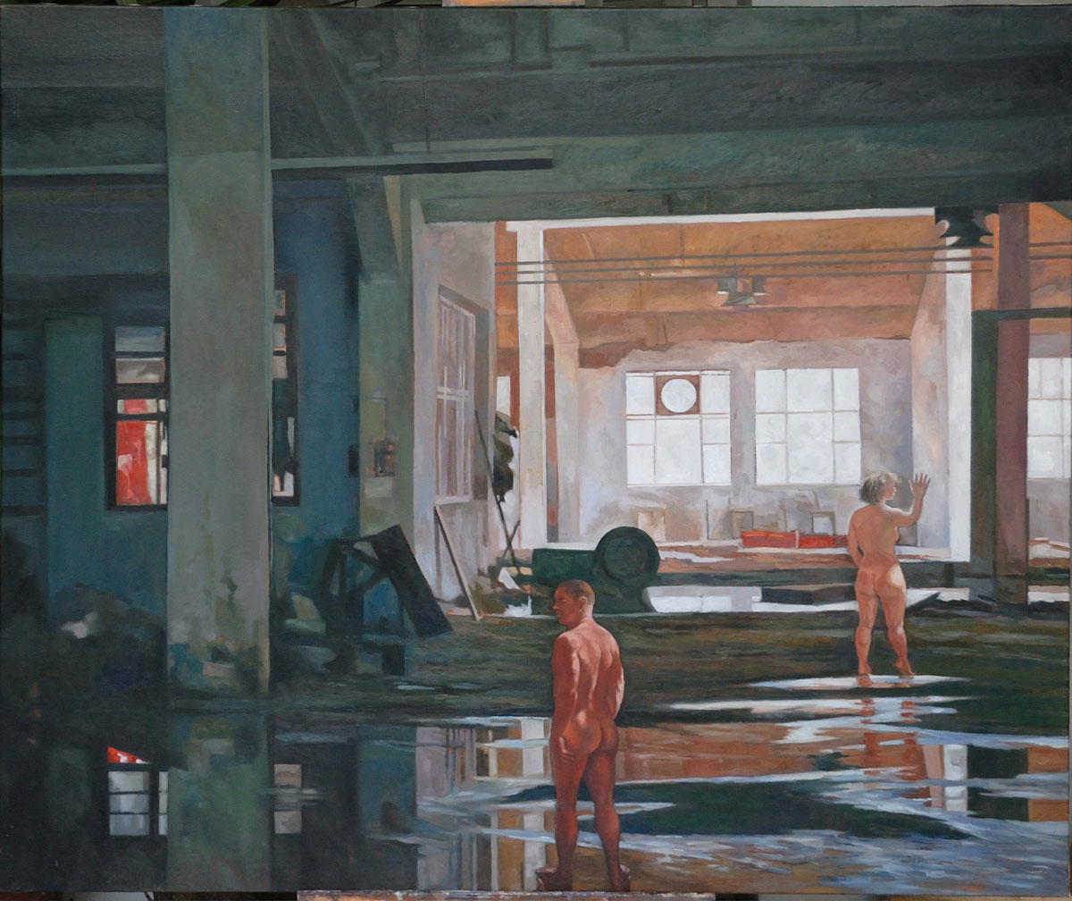 Στην έκθεση θα παρουσιαστούν έργα του (λάδια και χαρακτικά) που αποτυπώνουν στιγμές και όψεις από τοπία στην Ελλάδα, καθώς και από εργοστασιακούς χώρους. Στη σειρά των έργων με θέμα τους εργοστασιακούς χώρους, ο Ανδρουτσάκης αναζητά στη σιωπή των εγκαταλειμμένων εργοστασίων τα χνάρια του χρόνου, αποκαλύπτοντας μέσα από τα χαλάσματα ό,τι διαφεύγει ως εικόνα και αίσθημα. Οι ανθρώπινες μορφές που παρουσιάζονται μέσα στα ερείπια υποδηλώνουν τη φθορά, αλλά και ταυτόχρονα την αναγέννηση, έναν υπαινιγμό του έρωτα και του θανάτου. Στη σειρά των τοπίων κυριαρχούν οι αφαιρετικές και κολοριστικές προσπάθειες προσέγγισης των θεμάτων, χωρίς βέβαια να απομακρύνεται ο καλλιτέχνης από τη φυσιοκρατική απόδοσή τους.