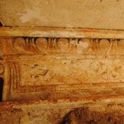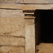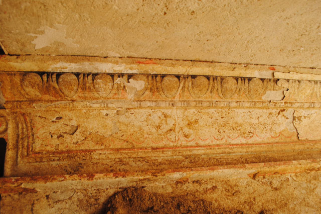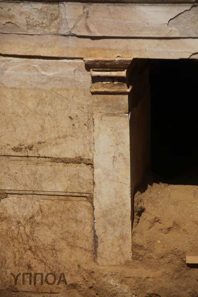 Παράλληλα, αποκαλύπτονται, κάτω από τα επίκρανα, οι μαρμάρινες παραστάδες του θυρώματος, οι οποίες επικαλύπτονται, επίσης, από λευκή νωπογραφία. Με τη μερική αφαίρεση χωμάτων, που βρίσκονται πίσω από την είσοδο, αποκαλύπτεται η πίσω πλευρά της εισόδου, ιδιαιτέρως επιμελημένη, αντίστοιχη της προσόψεως. Επί της νωπογραφίας των επιστυλίων της σώζονται ίχνη κόκκινου και μαύρου χρώματος. Η πλαϊνή και πίσω όψη των ιωνικών επικράνων των παραστάδων, που επικαλύπτονται από νωπογραφία, είναι επιζωγραφισμένες με τα ίδια χρώματα.