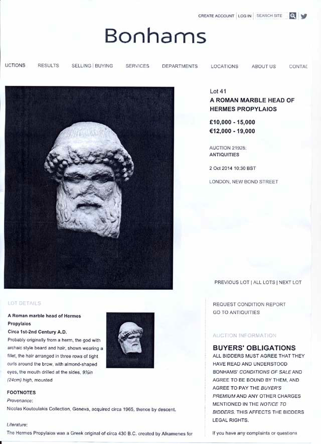 Μια μαρμάρινη κεφαλή Ερμή, η οποία περιλαμβανόταν στα αντικείμενα που επρόκειτο να δημοπρατηθούν στις 2 Οκτωβρίου 2014 από τον Οίκο Δημοπρασιών Bonhams στο Λονδίνο, τράβηξε την προσοχή της Διεύθυνσης Τεκμηρίωσης και Προστασίας Πολιτιστικών Αγαθών του Υπουργείου Πολιτισμού και Αθλητισμού, κατά τη διάρκεια ελέγχου που πραγματοποιήθηκε στον ηλεκτρονικό κατάλογο της δημοπρασίας (στις 10 Σεπτεμβρίου 2014).