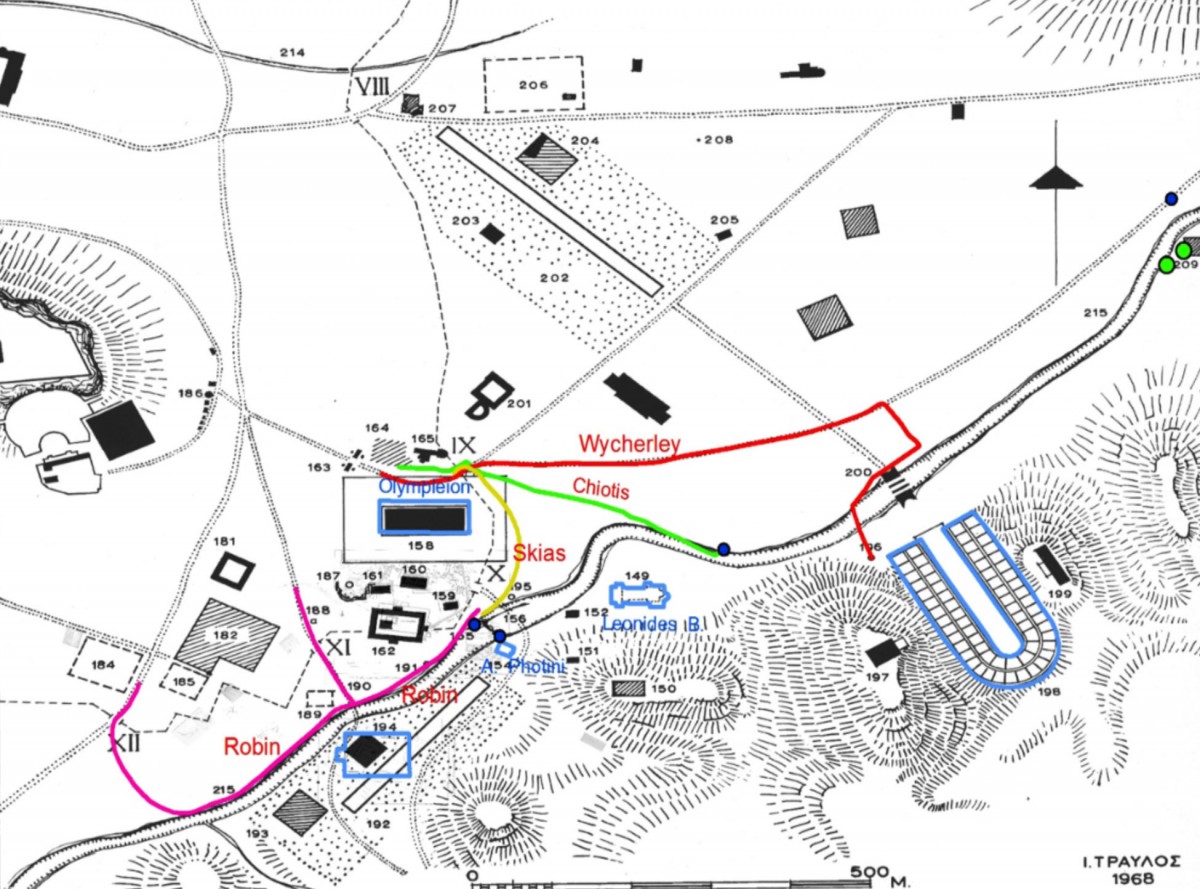 »Η αναγνώριση της τοπογραφίας του περιπάτου μέχρι την πλατάνα και των θέσεων που αναφέρονται προσέλκυσε πολλούς ερευνητές, οι απόψεις των οποίων προβάλλονται στο χάρτη. Κρίσιμοι παράγοντες αξιολόγησης, όπως η απόδοση του αρχαίου κειμένου, η πύλη εξόδου, ο δρόμος του περιπάτου, η κοίτη του Ιλισού κατά την κλασική αρχαιότητα και οι αρχαιολογικές απόψεις για τη θέση του Ιερού των Νυμφών και τη διάβαση του Ιλισού οδηγούν σε διαφορετικές εκδοχές για την τοπογραφία του φιλοσοφικού περιπάτου» (εικ. 1).