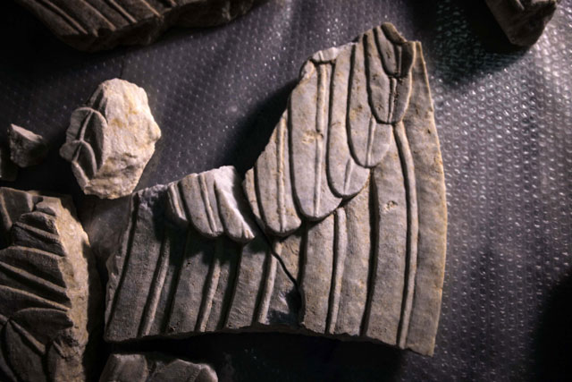 Σύμφωνα πάντα με την ανακοίνωση του ΥΠΠΟΑ, κάτω από τους πωρόλιθους του δαπέδου, μέσα στην αφαιρούμενη επίχωση, βρέθηκαν τα τμήματα των φτερών των Σφιγγών, ένα μέρος από τον λαιμό της δεύτερης Σφίγγας –ίδιας ποιότητας μαρμάρου και εφάμιλλης γλυπτικής αξίας– καθώς και τμήματα από το ελλείπον τμήμα του μοναδικού ψηφιδωτού, με την εικόνα της αρπαγής της Περσεφόνης από τον Πλούτωνα, που καλύπτει το δάπεδο του δεύτερου θαλάμου (τρίτου χώρου), πίσω από τις Καρυάτιδες.