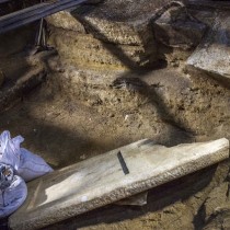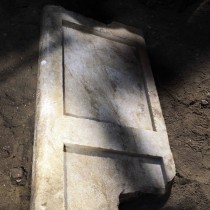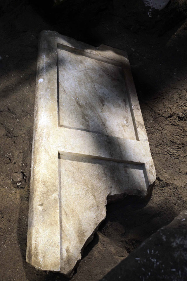 Επίσης, κατά την αποχωμάτωση του τέταρτου χώρου διαπιστώθηκε η ύπαρξη τεχνητού ορύγματος επί του φυσικού σχιστολιθικού εδάφους, επιφάνειας, 4×2,10 μ., το οποίο είναι γεμάτο με ιλυώδη άμμο. Ήδη έχει προχωρήσει η ανασκαφή σε βάθος περίπου 1,40 μ. από την επιφάνεια του κατωφλίου και η επίχωση συνεχίζεται. Κατά την απομάκρυνση της αμμώδους επίχωσης εντοπίστηκε, πεσμένο μέσα στο όρυγμα, το δεύτερο μαρμάρινο θυρόφυλλο, σε καλή κατάσταση διατήρησης, διαστάσεων, 2×0,90×0,15 μ. και βάρους περίπου 1,5 τόνου. Σήμερα επιχειρείται η απομάκρυνσή του από το σημείο εύρεσης.