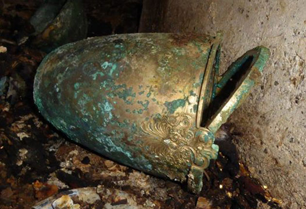 Η διαδικτυακή αρχαιολογική ανακοίνωση συνοδεύεται από φωτογραφία μεταλλικού κάδου (σκεύος συμποσίου στο οποίο ανακάτευαν τον οίνο και το νερό) στη θέση που βρέθηκε πεσμένος, στο δάπεδο του τάφου. Το αγγείο είναι χάλκινο (φέρει δείγματα οξείδωσης) και φέρει διακόσμηση που καταδεικνύει το «εξαιρετικό επίπεδο της μακεδονικής μεταλλουργίας», όπως η ίδια η κα Κοτταρίδη υπογραμμίζει στην ανάρτησή της.