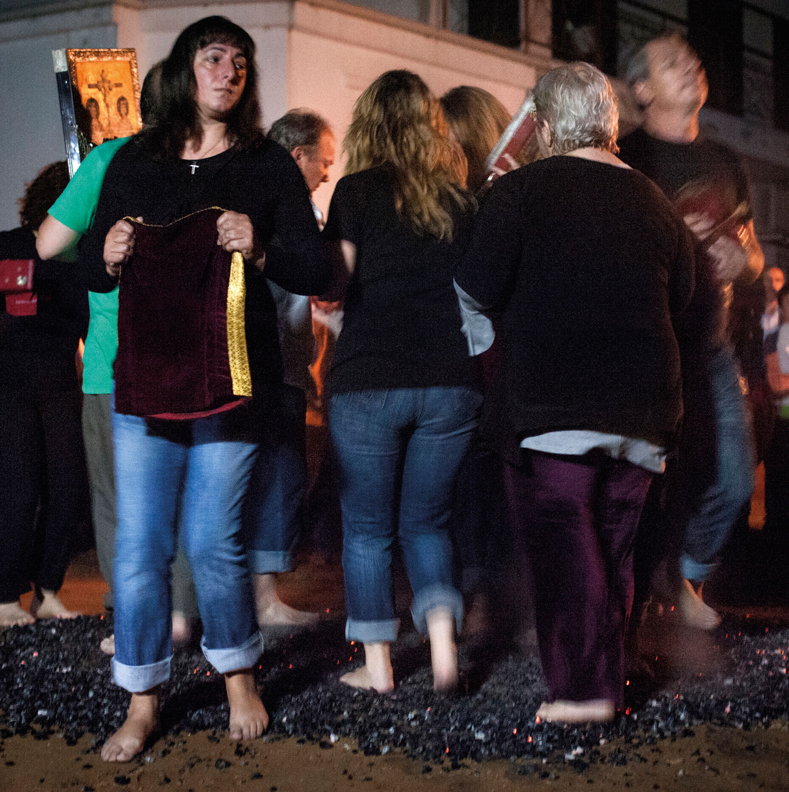 Οι εικόνες που εκτίθενται ελήφθησαν από το 2011 έως το 2014 στην Αγία Ελένη Σερρών και στον Λαγκαδά Θεσσαλονίκης και αποτελούν τμήμα πολύχρονης εργασίας του φωτογράφου με πρόθεση την αποτύπωση και την καλλιτεχνική απόδοση της εξέλιξης της ιεροπραξίας, μέσα από την ένταση των συναισθημάτων που εκφράζονται στα πρόσωπα και τα σώματα των ιερουργών καθ’ όλη τη διάρκεια της τελετουργίας: από την αρχική ηρεμία και την ευλάβεια, στο άναμμα της φωτιάς, από την άντληση δύναμης διαμέσου του χορού στο «κονάκι» –όπως ονομάζουν τον χώρο του ιερού τους– έως την έκσταση που βιώνουν οι χορευτές πάνω στα κάρβουνα. Οι φωτογραφίες προσπαθούν να αποδώσουν όσο το δυνατό πιο παραστατικά το στίγμα της γιορτής, δίχως εντυπωσιασμό αλλά με την απαιτούμενη «ζεστασιά», συγκίνηση και ιερότητα, έτσι όπως ενυπάρχει στο δρώμενο.