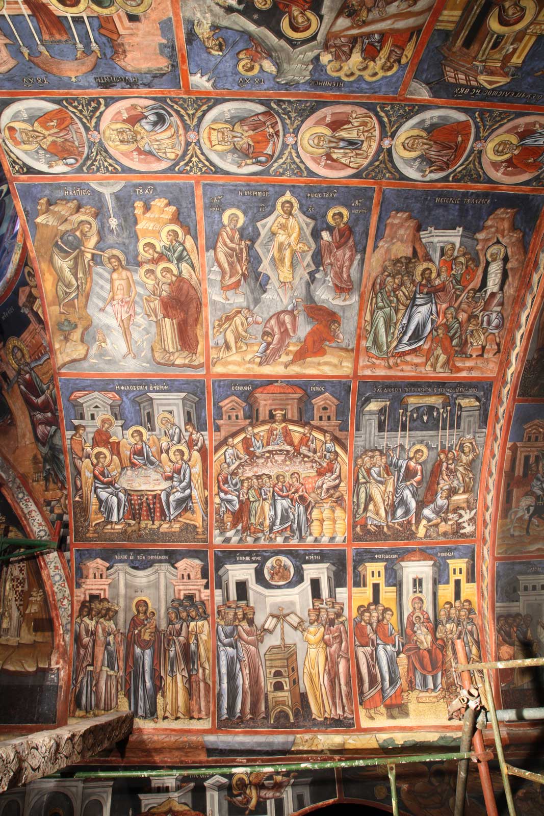 Α.Λ.: Όχι, όχι, λειτουργεί κανονικά ως εκκλησία, απλά παρακαλέσαμε τώρα, μετά τη συντήρηση, να μην ανάβουν τα κεριά και αρχίσουν να μαυρίζουν και πάλι οι τοιχογραφίες, γιατί δεν έχουμε κάνει τίποτα. Οι τοιχογραφίες, ξέρετε, δεν ήτανε πολύ κατεστραμμένες. Απλώς αυτό που τις κάλυπτε ήταν η αιθάλη και, επιπλέον, κάποια σημεία είχαν πάρα πολύ μεγάλη υγρασία. Θεωρώ, λοιπόν, πολύ σημαντικό το ότι μια δουλειά συντήρησης που είχε αρχίσει από την 1η τότε Εφορεία Βυζαντινών Αρχαιοτήτων, με όλες τις συγκινητικές προσπάθειες που πάντα κάνει η Εφορεία για την ανεύρεση πόρων και με τις προσπάθειες τότε του κυρίου Πέννα, μπόρεσε να ολοκληρωθεί τώρα μ’ αυτή την ιαπωνική συνεργασία.