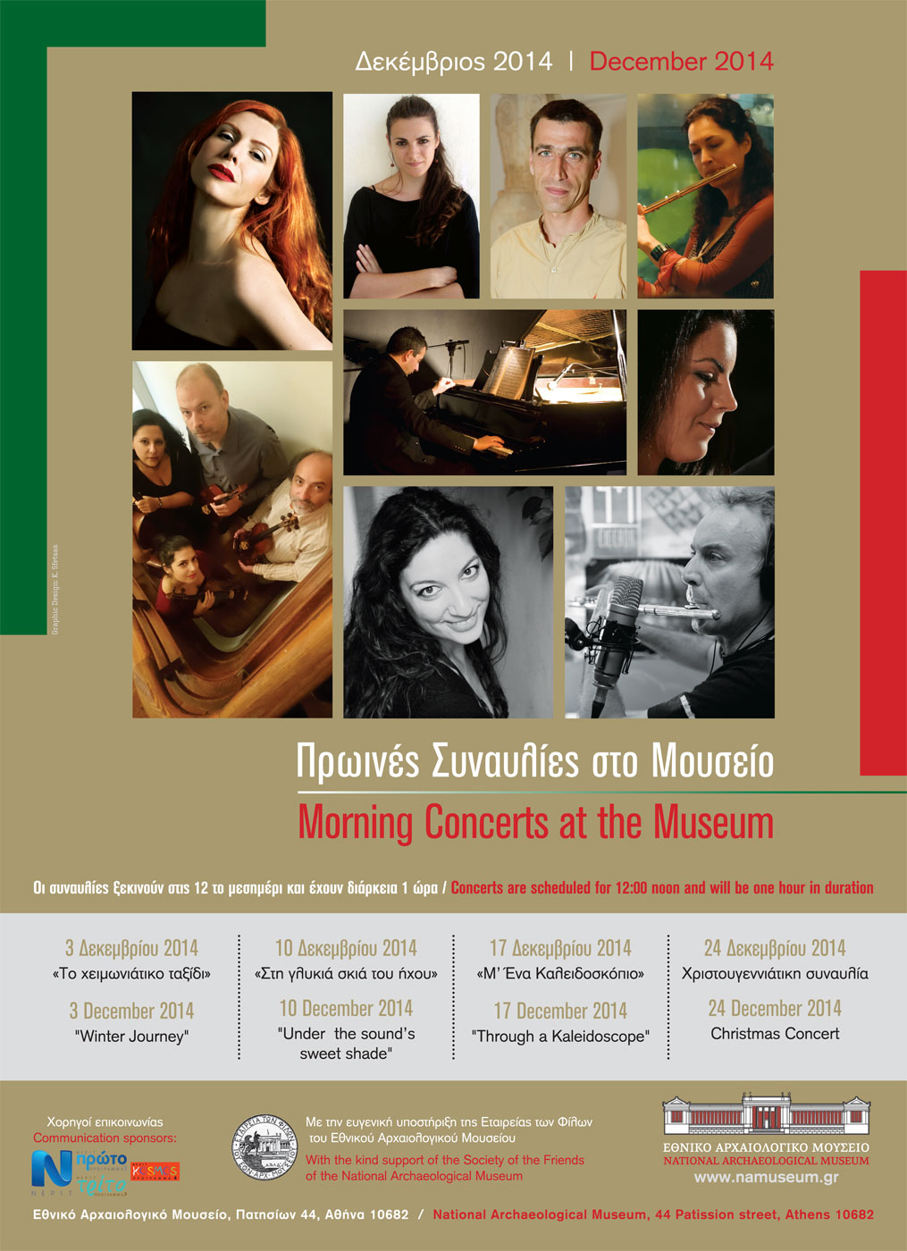 Το Εθνικό Αρχαιολογικό Μουσείο, μετά τον πρώτο επιτυχημένο κύκλο πρωινών συναυλιών για τους επισκέπτες του, τον οποίο εγκαινίασε τον περασμένο Μάιο, οργανώνει τις Τετάρτες του Δεκεμβρίου πρωινές συναυλίες μικρών μουσικών συνόλων στην Αίθουσα του Βωμού.