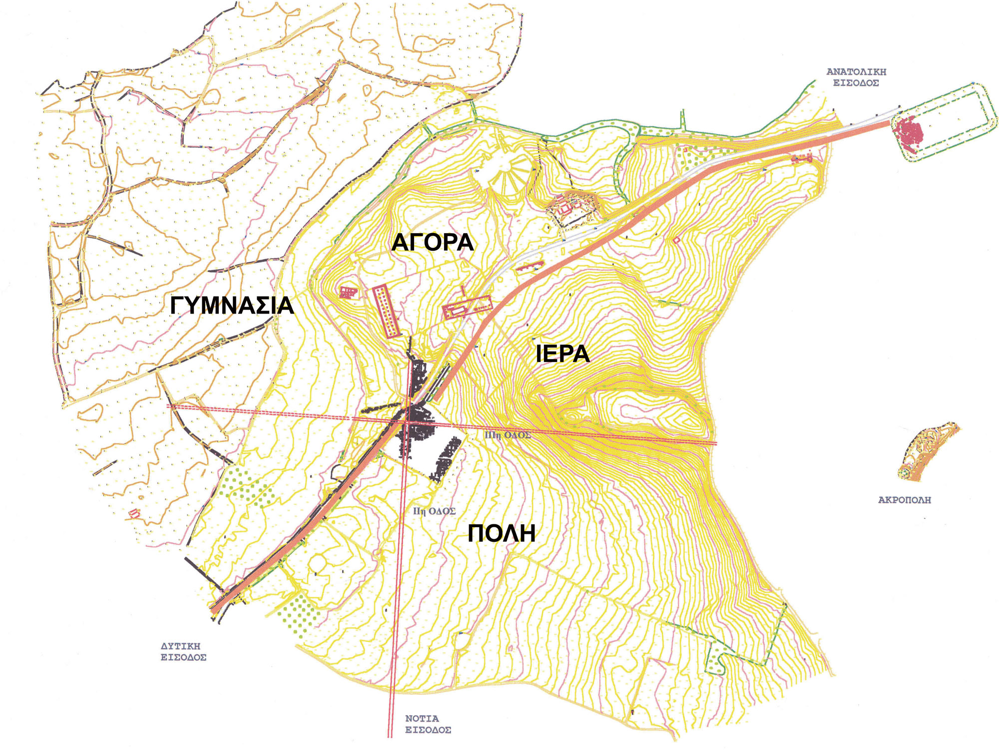 Τμήματα επτά οδών της «ιπποδάμειας» χάραξης έχουν αποκαλυφθεί (εικ. 4 και 9-10). Η ΙΙη οδός, με προσανατολισμό Β-Ν, στο Β άκρο της οποίας βρίσκεται, όπως ήδη αναφέρθηκε, η δυτική όψη των κτιρίων του ΝΔ τμήματος της Αγοράς, αποτελεί τοn βασικό άξονα του πολεοδομικού ιστού, ο οποίος προϋπήρχε πιθανότατα στο χώρο, συνδέοντας την κύρια νότια είσοδο της πόλης με την Αγορά και τους χώρους άθλησης, και σε αυτόν στηρίζεται όλη η χάραξη. Κάθετα στη ΙΙη οδό χαράσσονται η Ιη και η ΙΙΙη οδός με προσανατολισμό Δ-Α. Από τις οδούς ΙΙ και ΙΙΙ έχουν αποκαλυφθεί οι τελευταίες οικοδομικές φάσεις τους, σε μήκος 200 και 50 μ. αντίστοιχα, και η διαμόρφωση που αυτές είχαν λάβει στους αυτοκρατορικούς χρόνους ενώ στην οδό Ι, πλάτους σχεδόν 7 μ., έχουν διαπιστωθεί δύο οδοστρώματα των κλασικών χρόνων με πρώτο αυτό του 5ου αι. π.Χ. Ο αρχαιότερος οδικός άξονας του χώρου με κατεύθυνση ΝΔ-ΒΑ, διατηρείται μέσα στον ορθογώνιο πολεοδομικό ιστό τον οποίο διασχίζει λοξά, ενώ διασταυρώνεται με τις οδούς ΙΙ και ΙΙΙ στο κεντρικότερο σημείο της πόλης (εικ. 4). Τμήμα μήκους περίπου 100 μ. του διαχρονικού αυτού άξονα κατά μήκος της βόρειας πλευράς της σύγχρονης επαρχιακής οδού καθώς και μικρά τμήματα τριών ακόμη οδών του πολεοδομικού ιστού με κατεύθυνση Α-Δ κάθετων σε αυτή, έχουν εντοπισθεί αλλά δεν είναι σήμερα ορατά.