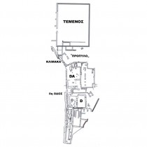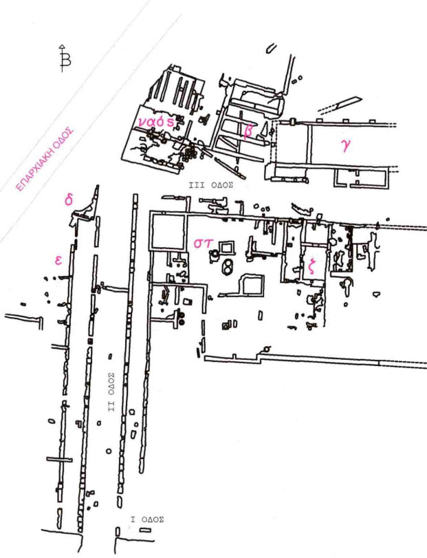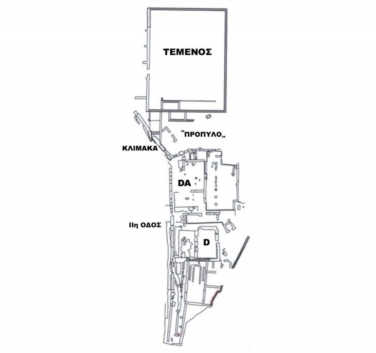 Ο χώρος μεταξύ των δύο άκρων των μεγάλων στοών στο ΝΔ άκρο του πλατώματος της Αγοράς αποτελεί το κεντρικότερο και πλέον πολυσύχναστο σημείο της πόλης καθώς βρίσκεται στη συμβολή των κεντρικών αρτηριών, οι οποίες συνδέουν τις κύριες εισόδους της με την Αγορά και τα γυμνάσια. Εδώ, σε βαθμιδωτά επίπεδα, υπαγορευμένα από τη φυσική κλίση του εδάφους, αναπτύσσεται την περίοδο αυτή σειρά οικοδομημάτων λατρευτικής χρήσης, που ορίζονται στη δυτική πλευρά τους από το ανάλημμα του βόρειου άκρου της ΙΙης οδού, η οποία ήταν σε χρήση ήδη από τον 6ο αι. π.Χ. (εικ. 6-8). Στο νοτιότερο και πιο χαμηλό επίπεδο κτίζεται τον 5ο αι. π.Χ. μια στοά παράλληλη προς την ΙΙη οδό, από την οποία σώζονται μόνο ελάχιστα λείψανα των θεμελίων της κιονοστοιχίας της (εικ. 7-8). Αμέσως βόρεια κτίζεται σύγχρονο με αυτή διμερές ναόσχημο οικοδόμημα (D), διαστάσεων 15×12 μ., το οποίο έχει είσοδο στη δυτική πλευρά προς την οδό ΙΙ και δεν έχει έως σήμερα ταυτισθεί με κάποιο από τα αναφερόμενα από τον Παυσανία ιερά. Από το κλασικό κτίριο έχει ανασκαφεί και είναι σήμερα ορατό το κατώτερο τμήμα, κατασκευασμένο με μεγάλους λαξευμένους πωρόλιθους (εικ. 7-8). Στο επόμενο υψηλότερο επίπεδο, ήδη κατά τον 5ο αι. π.Χ., κτίζεται ορθογώνιο οικοδόμημα (κτίριο Dα), διαστάσεων 11×15 μ. (εικ. 7-8). Από την πρώτη οικοδομική του φάση σώζεται μόνο γωνία τοίχων από επιμελώς επεξεργασμένους πωρόλιθους. Στο τέλος του 5ου-αρχές του 4ου αι. π.Χ. στο κτίριο γίνονται επεμβάσεις και από αυτήν την οικοδομική φάση του σώζονται στους τοίχους της βόρειας και της ανατολικής πλευράς σειρές μεγάλων ορθογώνιων οπτόπλινθων, οι οποίες χρησιμοποιήθηκαν και στο δάπεδο. Τα ευρήματα από το εσωτερικό του κτιρίου υποδηλώνουν λατρευτική χρήση. Την ίδια περίοδο στο βορειότερο επίπεδο ιδρύεται ή συνεχίζει να υπάρχει από τον 6ο αι. π.Χ., μικρό ορθογώνιο διμερές κτίσμα, με είσοδο ανατολικά. Από το κτίσμα αυτό έχει ανασκαφεί και είναι σήμερα ορατό μόνο τμήμα της θεμελίωσης κατασκευασμένης από πωρολίθους ενώ έχει υποστηριχθεί η απόδοσή του σε ναΐσκο (εικ. 7-8). Στο βορειότερο και πιο υπερυψωμένο επίπεδο τον 4ο αιώνα π.Χ. ιδρύεται ορθογώνιος περίβολος τεμένους (εικ. 7-8). Από το κλασικό κτίριο σήμερα σώζεται και είναι ορατό μέρος μόνο της θεμελίωσης από πωρολίθους στη δυτική πλευρά με άνοιγμα εισόδου με παραστάδες. Το τέμενος και το ναΐσκο με τον αποθέτη οριοθετεί δυτικά και νότια λίθινος τοίχος (εικ. 7-8). Κατά τον 4ο αι. π.Χ. κτίζεται επίσης μεταξύ των κτιρίων D και Dα ισχυρός πολυγωνικός τοίχος (εικ. 7-8).