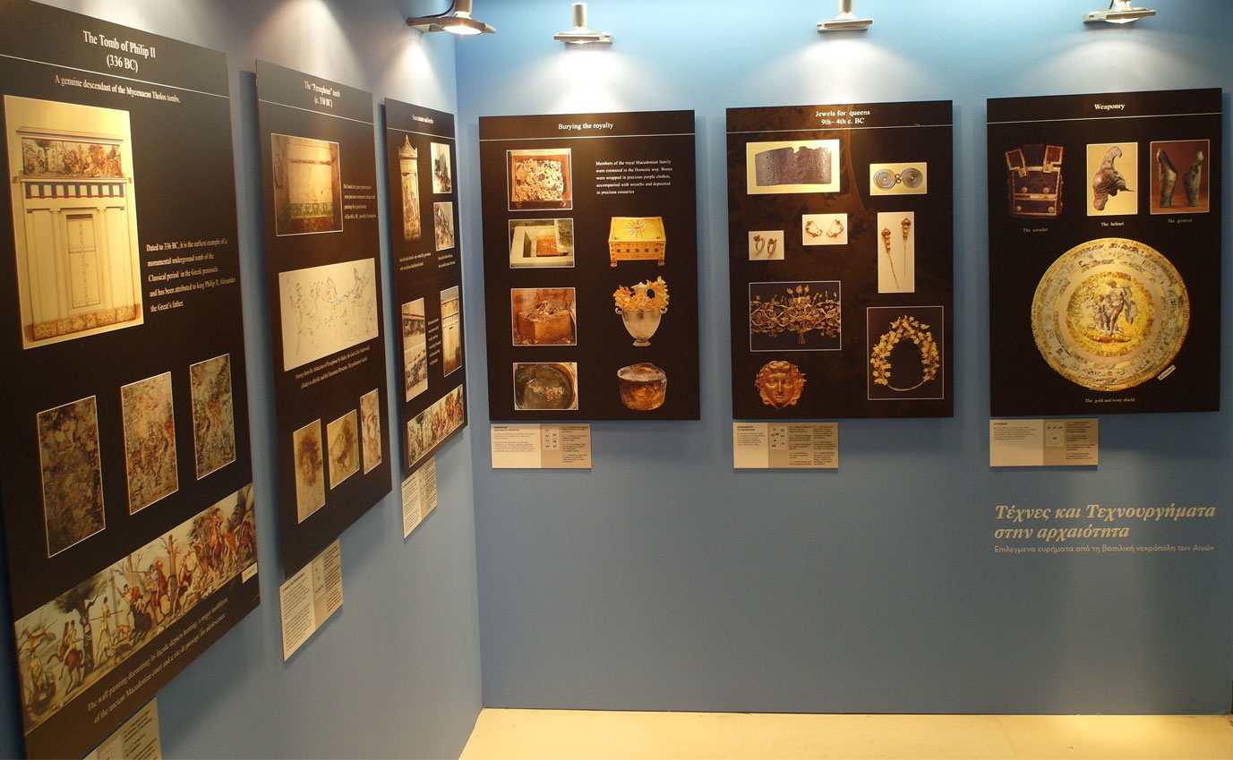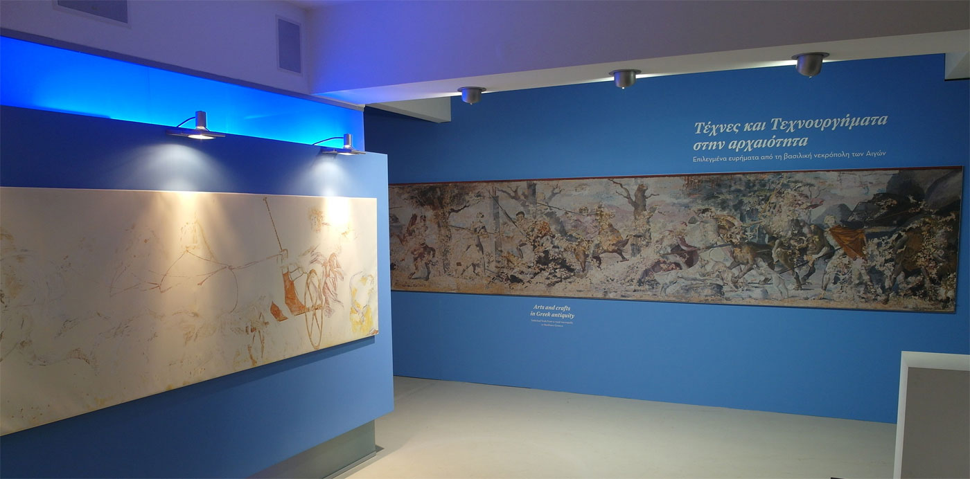 Στα εκθέματα περιλαμβάνονται και αναπαραγωγές, σε φυσικό μέγεθος, των δύο μνημειακών τοιχογραφιών από τους βασιλικούς τάφους της Μεγάλης Τούμπας: της ζωφόρου με το κυνήγι λιονταριού από τον τάφο του Φιλίππου Β’ και της Aρπαγής της Περσεφόνης από τον Άδη, που κοσμεί το εσωτερικό του λεγόμενου Τάφου της Περσεφόνης.