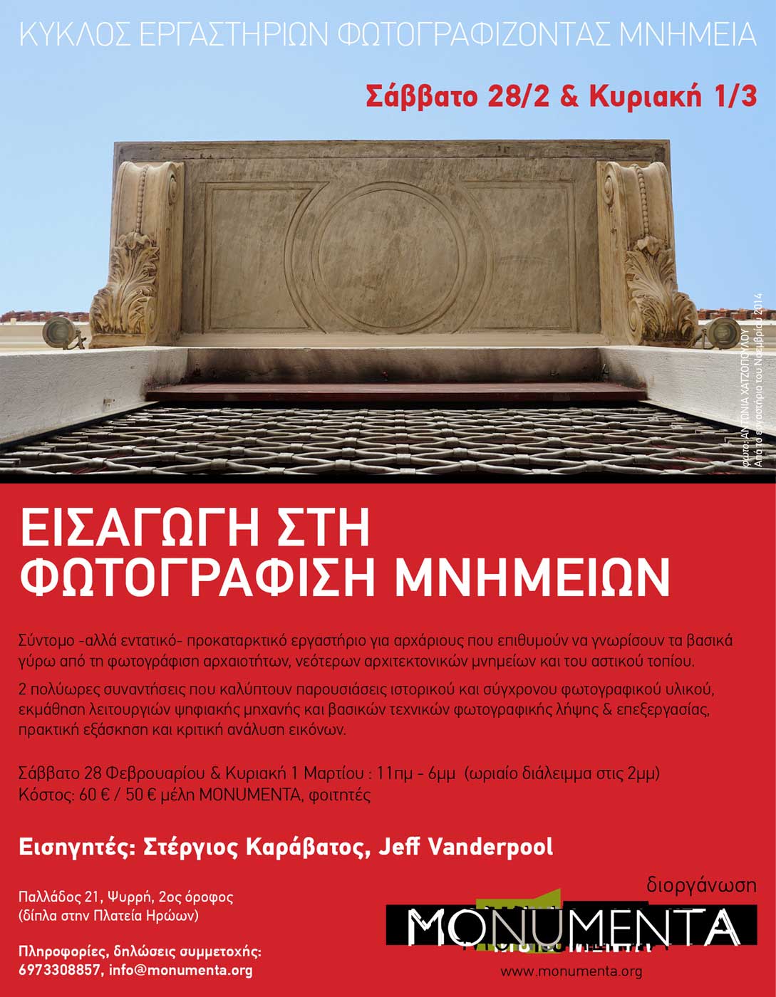 Ένα σύντομο –αλλά εντατικό– προκαταρκτικό εργαστήριο για αρχάριους που επιθυμούν να γνωρίσουν τα βασικά γύρω από τη φωτογράφιση αρχαιοτήτων, νεότερων αρχιτεκτονικών μνημείων και του αστικού τοπίου διοργανώνει η MONUMENTA.