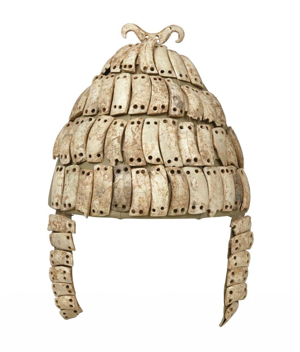 Ο άνδρας φορά ένα οδοντόφρακτο κράνος, κατασκευασμένο από χαυλιόδοντες αγριόχοιρου, που, διαμορφωμένοι κατάλληλα, ράβονταν σε σειρές πάνω σε έναν δερμάτινο σκούφο. Η κατασκευή του απαιτούσε τη θανάτωση στο κυνήγι πολλών ζώων και αποδείκνυε περίτρανα την ανδρεία του κατόχου του.