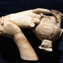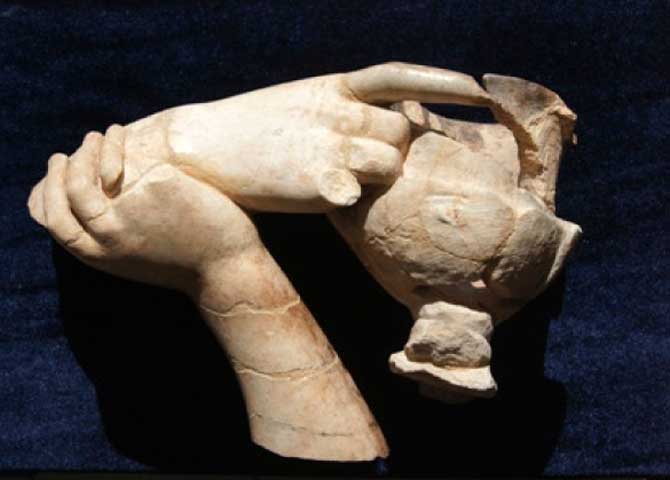 Συμπληρωματικά, επίσης για πρώτη φορά, εκτίθεται μαρμάρινο σύμπλεγμα χεριών που κρατούν τελετουργικό αγγείο πόσης.