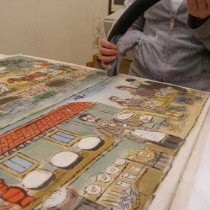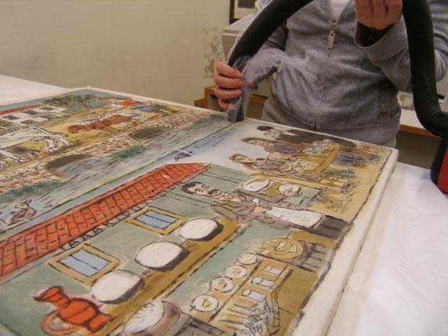 Κατά το πρώτο στάδιο έγιναν εργασίες όπως αφαίρεση των έργων από τα ξύλινα τελάρα, επιφανειακός καθαρισμός, συμπλήρωση περιοχών απώλειας, αντιμετώπιση της βιολογικής προσβολής, καθώς και τοποθέτησή τους με ράψιμο σε νέες βάσεις υποστήριξης, κατάλληλα κατασκευασμένες από τους συντηρητές για ζωγραφικά έργα σε ύφασμα.