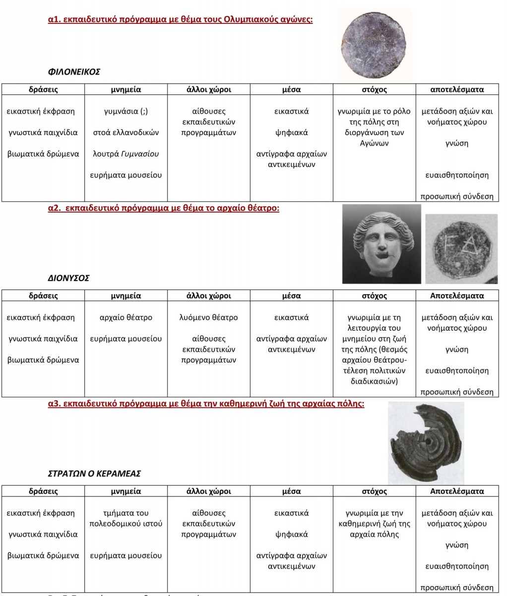 1α. Διοργάνωση εκπαιδευτικών προγραμμάτων για μαθητές όλων των εκπαιδευτικών βαθμίδων. Τα προγράμματα αυτά μπορούν να οργανωθούν γύρω από βασικές θεματικές σχετιζόμενες με το χώρο, να χρησιμοποιήσουν μνημεία, κινητά και ακίνητα, σχετιζόμενα με κάθε θεματική, να διατηρούν τη δυνατότητα να εξειδικεύονται ανάλογα με την εκπαιδευτική βαθμίδα των συμμετεχόντων αλλά και να συνδυάζονται μεταξύ τους δημιουργώντας ένα ολοκληρωμένο πρόγραμμα γνωριμίας με το χώρο. Η σύνθεση των προγραμμάτων θα είναι σχεδιασμένη ώστε να προωθεί μια βιωματική προσέγγιση της γνώσης και να επιτυγχάνει την προσέγγιση των παιδιών με τα μνημεία. Θα εμπεριέχει δράσεις εικαστικής έκφρασης, γνωστικής εμπέδωσης, δημιουργικού παιχνιδιού και βιωματικών δρωμένων, με συμμετοχή πάντα των παιδιών. Ενδεικτικά προτείνονται τρία εκπαιδευτικά προγράμματα με τρεις αντίστοιχα χαρακτηριστικές του χώρου θεματικές (εικ. 3), τα οποία προτείνεται να θεσμοθετηθούν και να πραγματοποιούνται συστηματικά, απευθυνόμενα στη μαθητική κοινότητα κυρίως της περιοχής αλλά και άλλων περιοχών (Περιφερειακές Ενότητες Αχαΐας, Ζακύνθου, Μεσσηνίας, Αιτωλοακαρνανίας κ.ά.). Η οργάνωση και λειτουργία των παραπάνω προγραμμάτων θα αποτελέσει στοχευμένη και αποτελεσματική δράση στην κατεύθυνση της επικοινωνίας του χώρου με άτομα μικρής ηλικίας, η σκέψη και νοοτροπία των οποίων βρίσκεται υπό διαμόρφωση, και τα οποία μέσω της εκπαιδευτικής διαδικασίας θα μπορέσουν να κατανοήσουν, να εμπεδώσουν και να εκτιμήσουν τις αξίες και τη σημασία που φέρει ο αρχαιολογικός χώρος, να αποκτήσουν εν τέλει γνώση αλλά και να αναπτύξουν μια προσωπική σχέση και σύνδεση με τα μνημεία, να τα αγαπήσουν, να τα εντάξουν στη ζωή τους, να τα προστατεύσουν, να τα σεβαστούν ουσιαστικά.