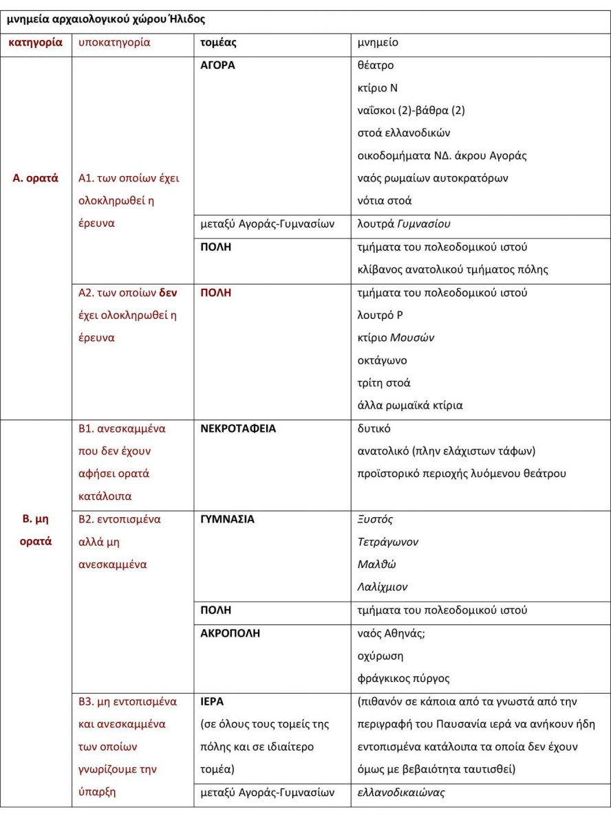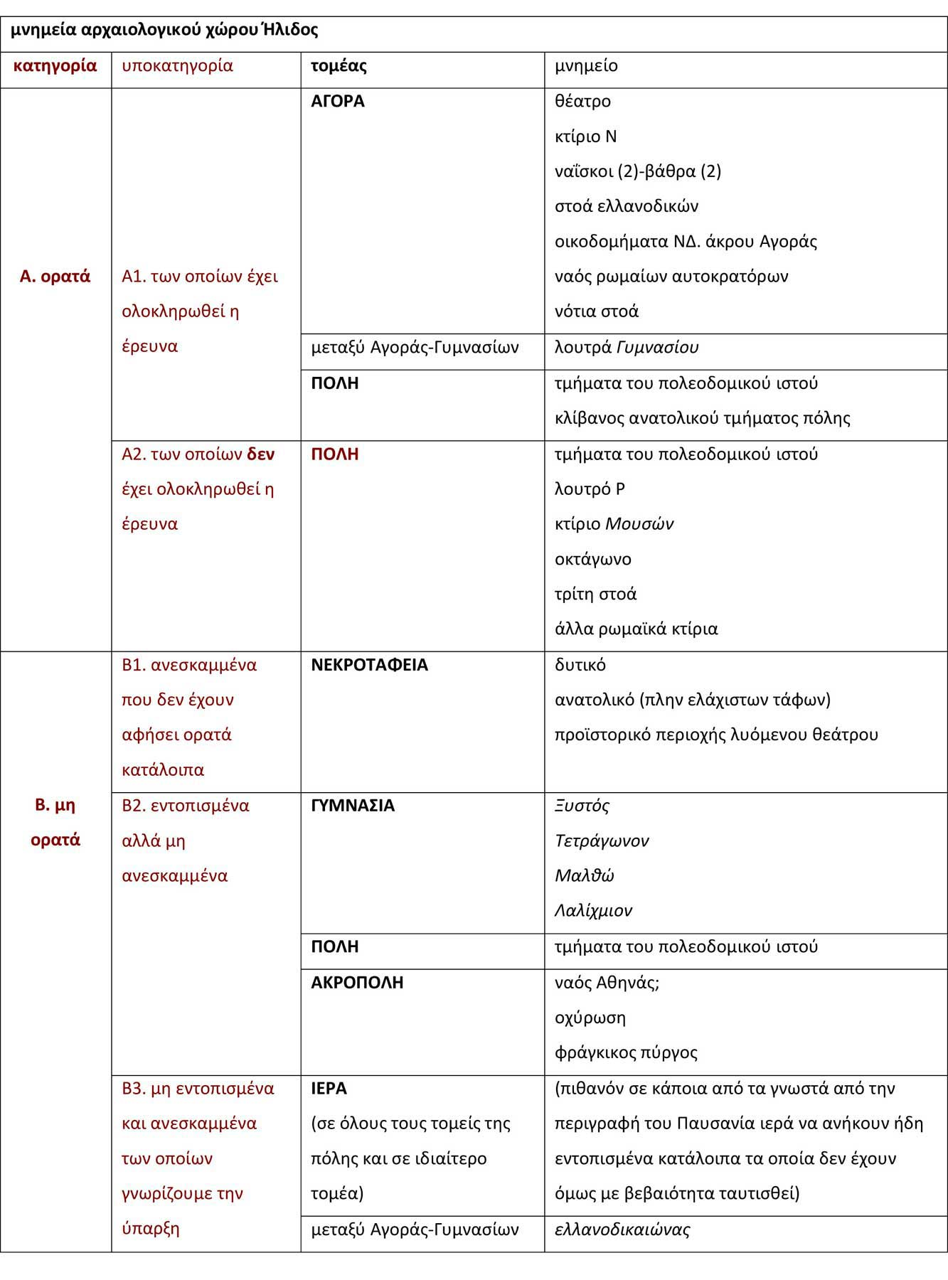 Κατηγορία Β3 (μνημεία των οποίων η ύπαρξη είναι γνωστή αλλά δεν έχουν εντοπισθεί): όσον αφορά στα μνημεία της κατηγορίας Β3, δηλαδή ουσιαστικά όσον αφορά στον τομέα των ιερών της πόλης, κρίνεται ότι η έρευνα για την αποκάλυψή τους θα πρέπει να αντιμετωπισθεί σε ένα απώτερο στάδιο και εφόσον έχει ολοκληρωθεί η έρευνα, συντήρηση και ανάδειξη όλων των άλλων μνημείων του χώρου και μόνο στο πλαίσιο της ανάδειξης μέρους του σημαντικού για τη λειτουργία της πόλης τομέα των ιερών, κανένα αναγνωρίσιμο τμήμα του οποίου δεν είναι σήμερα ορατό. Όσον δε αφορά στο κτίριο του ελλανοδικαιώνα, η αποκάλυψή του κρίνεται μεν σημαντική, λόγω της σχέσης του μνημείου με το θεσμό των Αγώνων αλλά και προκειμένου να συμπληρωθούν οι γνώσεις μας για τη λειτουργία και οργάνωση της αγοράς, θα πρέπει όμως και αυτή να αντιμετωπισθεί σε ένα απώτερο στάδιο.