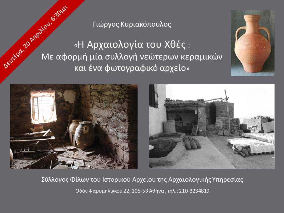 «Η Αρχαιολογία του Χθες: με αφορμή μια συλλογή νεώτερων κεραμικών και ένα φωτογραφικό αρχείο» είναι ο τίτλος διάλεξης του Γιώργου Κυριακόπουλου που διοργανώνει σήμερα, Δευτέρα 20 Απριλίου 2015, και ώρα 18.30, ο Σύλλογος Φίλων του Ιστορικού Αρχείου της Αρχαιολογικής Υπηρεσίας.