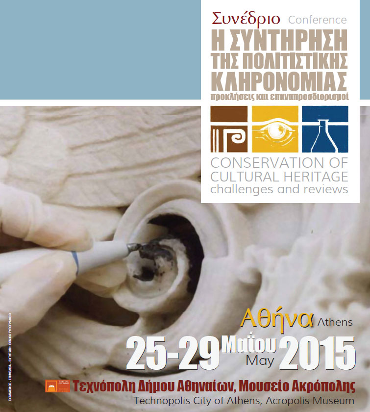 Με αφορμή τη συμπλήρωση 50 χρόνων από τη θέσπιση του τομέα συντήρησης στην Αρχαιολογική Υπηρεσία, καθώς και 30 χρόνων από την ίδρυση και λειτουργία του Τμήματος Συντήρησης Αρχαιοτήτων και Έργων Τέχνης στην τριτοβάθμια εκπαίδευση, η Διεύθυνση Συντήρησης Αρχαίων και Νεωτέρων Μνημείων του Υπουργείου Πολιτισμού, Παιδείας και Θρησκευμάτων και το Τμήμα Συντήρησης Αρχαιοτήτων και Έργων Τέχνης του ΤΕΙ Αθήνας συνδιοργανώνουν συνέδριο με θέμα «Η συντήρηση της πολιτιστικής κληρονομιάς: Προκλήσεις και επαναπροσδιορισμοί». Το συνέδριο θα πραγματοποιηθεί στις 25-29 Μαΐου 2015 στην Αθήνα, στο χώρο της Τεχνόπολης στο Γκάζι και στο Νέο Μουσείο Ακρόπολης.