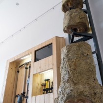 Δεκάδες μεγάλοι απολιθωμένοι κορμοί δέντρων, ιστάμενοι και κατακείμενοι, ριζικά συστήματα και κλαδιά δέντρων, φυλλοφόροι ορίζοντες με μεγάλη ποικιλία φύλλων μεταφέρουν ζωντανή την εικόνα του πεδίου ανασκαφής στην έκθεση.