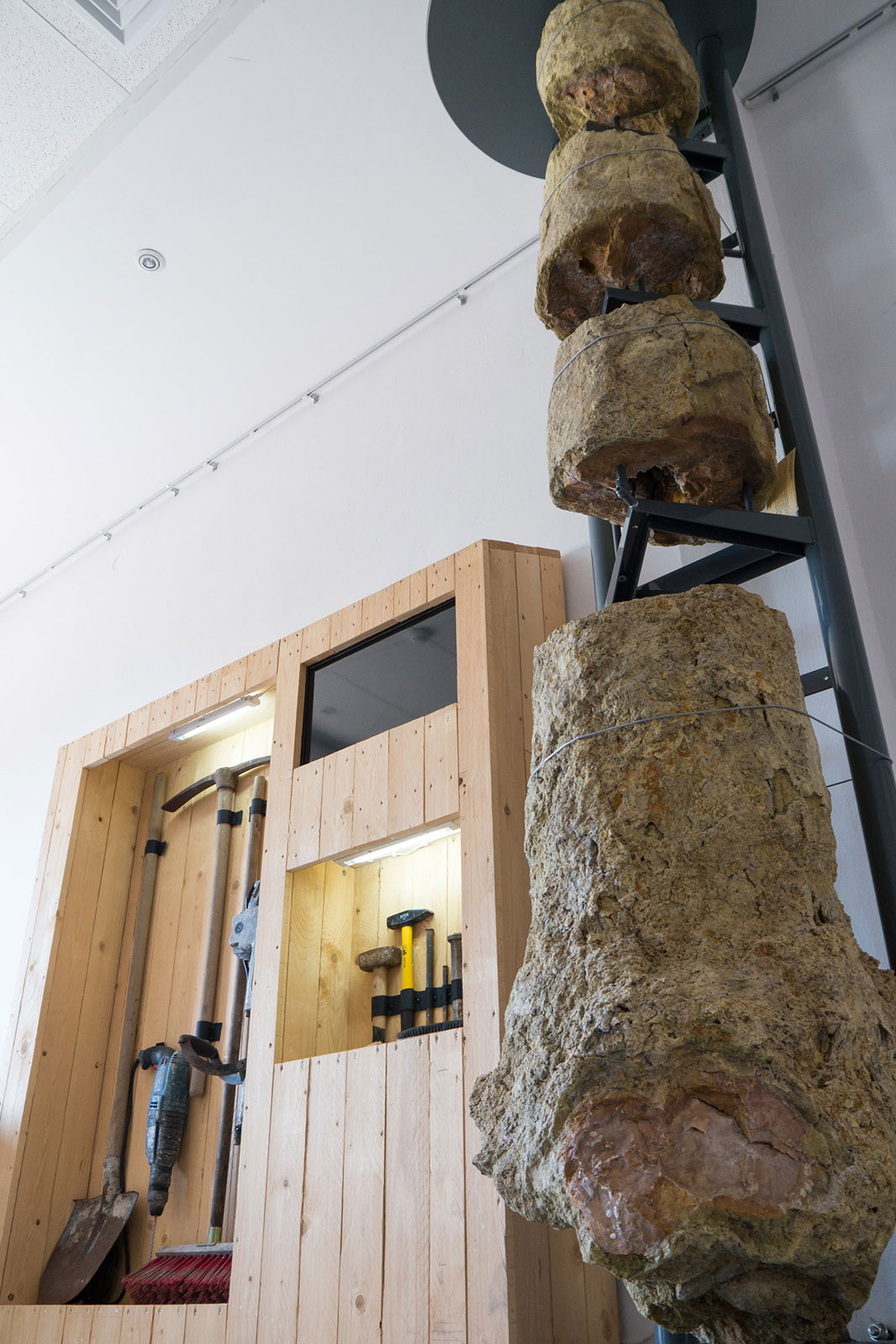 Μέσα από τις ενότητες της έκθεσης παρουσιάζονται μοναδικής επιστημονικής αξίας απολιθωμένα ευρήματα, πλούσιο φωτογραφικό υλικό όλων των φάσεων ανάδειξης και προστασίας των απολιθωμάτων, χάρτες διαδρομών στις επισκέψιμες θέσεις αλλά και χάρτες αποτύπωσης όλων των απολιθωματοφόρων θέσεων, τα όργανα αποτύπωσης, τα εργαλεία που χρησιμοποιήθηκαν σε κάθε στάδιο όπως εργαλεία και υλικά ανασκαφής και μεταφοράς, μικροεργαλεία καθαρισμού και συντήρησης των απολιθωμάτων.