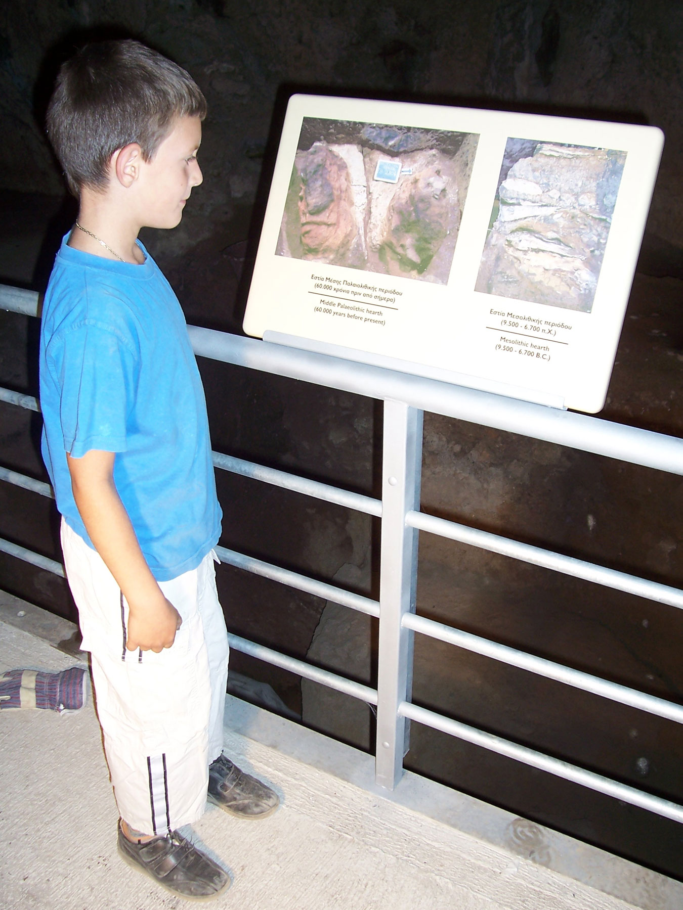 Στη συνέχεια της στρωματογραφίας, εκτίθενται ενδεικτικά: α) μία εστία φωτιάς της Παλαιολιθικής περιόδου από ένα σύνολο πολλών εστιών (τουλάχιστον 15) που έχουν χρονολογηθεί στα 60.000 χρόνια πριν από σήμερα και αντανακλούν ένα επεισόδιο βελτιωμένου κλίματος στη διάρκεια των παγετώνων, β) αντίγραφο της επιφάνειας με τα αποτυπώματα τεσσάρων ανθρώπινων πελμάτων που έχουν βρεθεί σε καμένη επιφάνεια ιζήματος που χρονολογείται στα 130.000 χρόνια πριν και αποτελούν παγκοσμίως πολύ σπάνιο εύρημα.