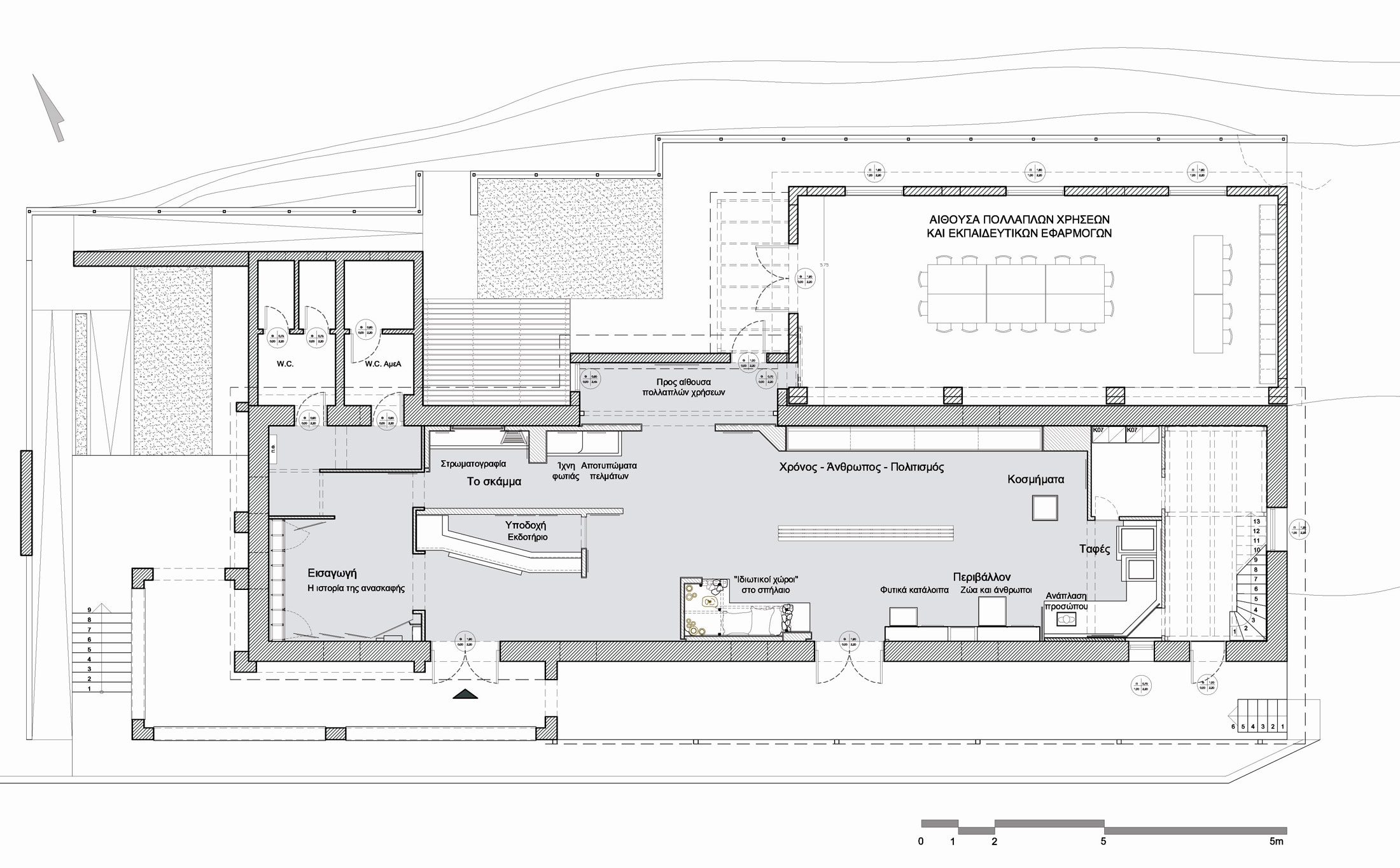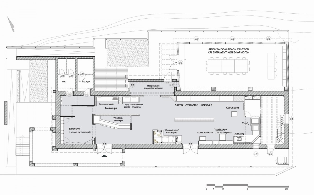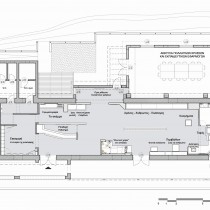 Στο ανακαινισμένο λοιπόν υφιστάμενο κτίσμα, οι χώροι του είχαν ήδη εναρμονιστεί με σύγχρονες προδιαγραφές για μια τέτοια λειτουργία και περιλάμβαναν εγκαταστάσεις για την πρόσβαση ΑΜΕΑ. ΄Υστερα από μελέτη προστέθηκε επιπλέον χώρος 82 τ.μ. στην πίσω ΒΑ πλευρά, κατ’ αναλογίαν με το προϋφιστάμενο αντίστοιχο τμήμα της ίδιας πλευράς (ΒΔ),  ώστε να μην αλλοιωθεί η αρχική μορφή του κτιρίου (εικ. 7). Ο νέος χώρος έχει διαμορφωθεί για τη λειτουργία εκπαιδευτικών προγραμμάτων, κυρίως για μαθητές-φοιτητές αλλά και για ομάδες ενηλίκων εφόσον το ζητήσουν.