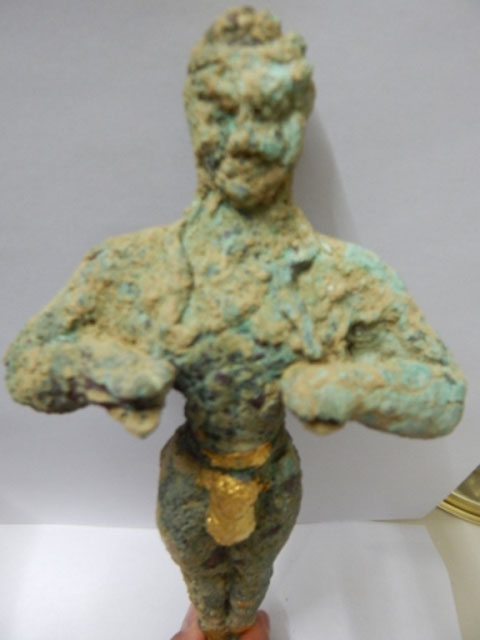 Σύμφωνα με πρώτη εκτίμηση αρμόδιου αρχαιολόγου της Εφορείας Αρχαιοτήτων Λασιθίου, πρόκειται για χάλκινο ειδώλιο, Μεσομινωικής περιόδου (16ος-15ος αι. π.Χ.), ύψους 30 εκ., που απεικονίζει έναν Κούρο σε στάση λατρείας με τα χέρια διπλωμένα στο στήθος. Φέρει μακριά κόμη, επιχρυσωμένο περίζωμα και σώζει φύλλα χρυσού στις γάμπες και το αριστερό γόνατο. Στη βάση του φέρει έμβολο που παραπέμπει στο ότι πιθανότατα ήταν στημένο σε βάθρο χώρου λατρείας. Κρίνεται δε ιδιαίτερα μεγάλης αξίας, καθόσον τα ιδιαίτερα χαρακτηριστικά του το καθιστούν μοναδικό εύρημα του είδους του στην ευρύτερη περιοχή της Κρήτης.