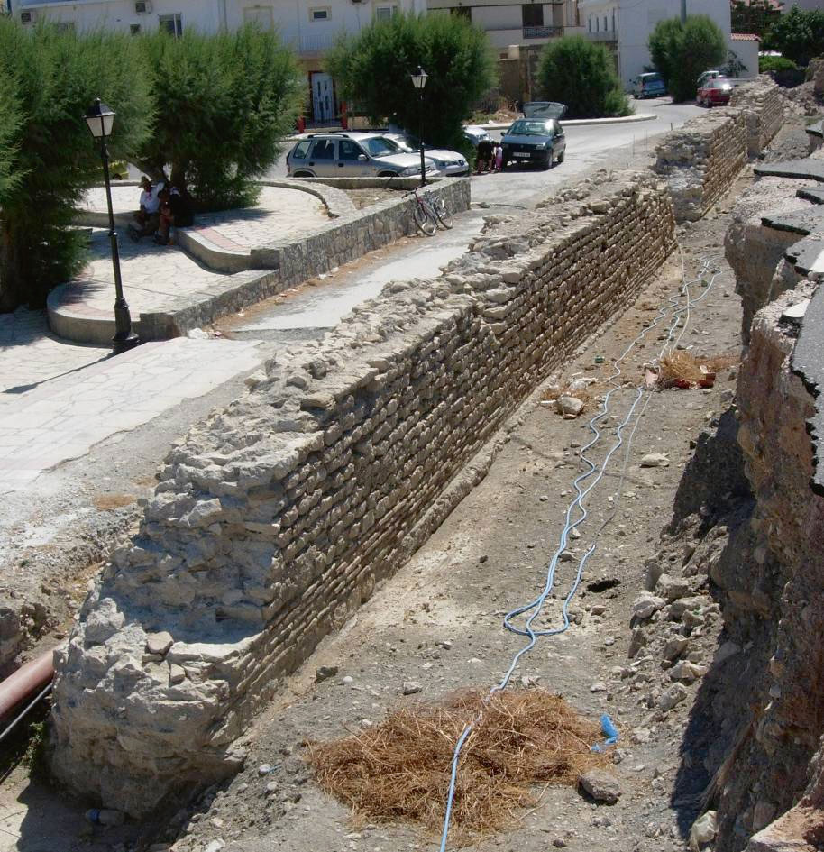 Ένα πρώιμο οχυρωματικό έργο συναντούμε στα δυτικά όρια της σημερινής Ιεράπετρας (αρχαία Ιεράπυτνα), όπου οχυρωματικός περίβολος προστατεύει το θαλάσσιο μέτωπο της πρωτοβυζαντινής πόλης ήδη από τον 6ο αιώνα (όπως συνάγεται από την ιδιαίτερη μορφολογία της κατασκευής). Ισχυρό τείχος με άφθονη χρήση οπτόπλινθων σώζεται σε αρκετά μεγάλο τμήμα παράλληλο με την ακτογραμμή (εικ. 1). Η τεχνική κατασκευής της τοιχοδομίας του τείχους ομοιάζει με αυτές που συναντούμε σε πρωτοβυζαντινές οχυρώσεις, τόσο στην πρωτεύουσα της Βυζαντινής Αυτοκρατορίας, την Κωνσταντινούπολη, όσο και σε σημαντικές πόλεις του ελλαδικού χώρου, όπως η Θεσσαλονίκη και η Νικόπολη. Η σχετικά πρόσφατη (2006-2008), διερεύνηση της οχυρωματικής αυτής κατασκευής προσφέρει πολύτιμες πληροφορίες για την οχυρωτική τέχνη στην Κρήτη, επειδή μέχρι σήμερα δεν είχαμε υπόψη μας τόσο πρώιμη βυζαντινή οχύρωση στο νησί. Πιθανότατα, πρόκειται για το μόνο γνωστό οχυρωματικό έργο της Ιουστινιάνειας περιόδου.