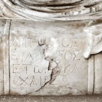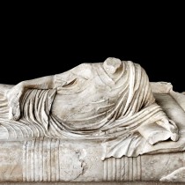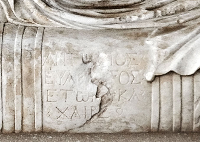Αυτή τη φορά η προσοχή του κοινού στρέφεται σε ένα εύρημα που εκτίθεται στον αύλειο χώρο του μουσείου. Πρόκειται για κάλυμμα μαρμάρινης σαρκοφάγου που μιμείται κλίνη, τα άκρα της οποίας κοσμούνται με ζωόμορφες κεφαλές και φύλλα άκανθας. Πάνω σε αυτήν βρίσκεται ξαπλωμένη νεαρή ανδρική μορφή, από την οποία λείπει το κεφάλι. Ο νεαρός άνδρας, που απεικονίζει τον νεκρό, είναι ντυμένος με χιτώνα και ιμάτιο και ακουμπά σε χαμηλό μαξιλάρι. Με το αριστερό χέρι κρατά ειλητάριο και με το δεξί, πιθανότατα, γιρλάντα με λουλούδια. Όπως μας δηλώνει το αποχαιρετιστήριο επίγραμμα, πρόκειται για τον πρόσχαρο και γλυκό Αντώνιο, ο οποίος πέθανε σε ηλικία είκοσι ενός ετών.