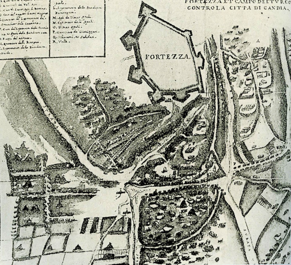 Μετά τις πρώτες τους αποτυχημένες προσπάθειες να καταλάβουν τον Χάνδακα, οι Τούρκοι αποφάσισαν να κατασκευάσουν γύρω από την πόλη ορμητήρια-φρούρια. Με σουλτανικό φιρμάνι, τον Φεβρουάριο του 1649, δίδεται η εντολή κατασκευής τριών οχυρών γύρω από τα τείχη του Χάνδακα: στην ανατολική ακτή απέναντι από το Λαζαρέττο, νότια της πόλης και δυτικά του ποταμού Γιόφυρου. Το τελευταίο μάλιστα απεικονίζεται στα σχεδιαγράμματα της εποχής σε αστερόσχημη μορφή με τέσσερις προμαχώνες. Από τα φρούρια αυτά δεν διασώζεται σήμερα κανένα ίχνος, ενώ δεν είναι γνωστή ούτε η ακριβής θέση τους. Ένα ακόμα φρούριο κατασκευάστηκε 5 χλμ. νότια της πόλης, στα υψώματα Ambrussa, στη θέση του σημερινού προαστίου Φορτέτζα (εικ. 1). Το φρούριο που ονομαζόταν Inadiye ή Kale-I Cedit (Νέο Φρούριο) ανεγέρθηκε από τον Γαζή Χουσεΐν Πασά κατά τα έτη 1648-1650 και αποτέλεσε την έδρα της διοίκησης και των οικονομικών υπηρεσιών του στρατού. Οι πηγές αναφέρουν ότι το οχυρό αυτό, που έφερε έξι προμαχώνες, δεν ήταν καλής κατασκευής αφού κατά τη διάρκεια ανέγερσής του, εξαιτίας των έντονων βροχοπτώσεων, κάποια τμήματά του κατέρρευσαν. Η προχειρότητα της κατασκευής του αλλά και η ανάπτυξη στο εσωτερικό του, από τον 18ο αι. και μετά, του οικισμού Φορτέτζα, είχαν ως αποτέλεσμα την σχεδόν ολοκληρωτική καταστροφή του. Σήμερα, στα άκρα του λόφου, διασώζονται μικρά τμήματα του περιβόλου της δυτικής και ανατολικής πλευράς του με την εξωτερική επένδυσή τους από ορθογώνιους λίθους.