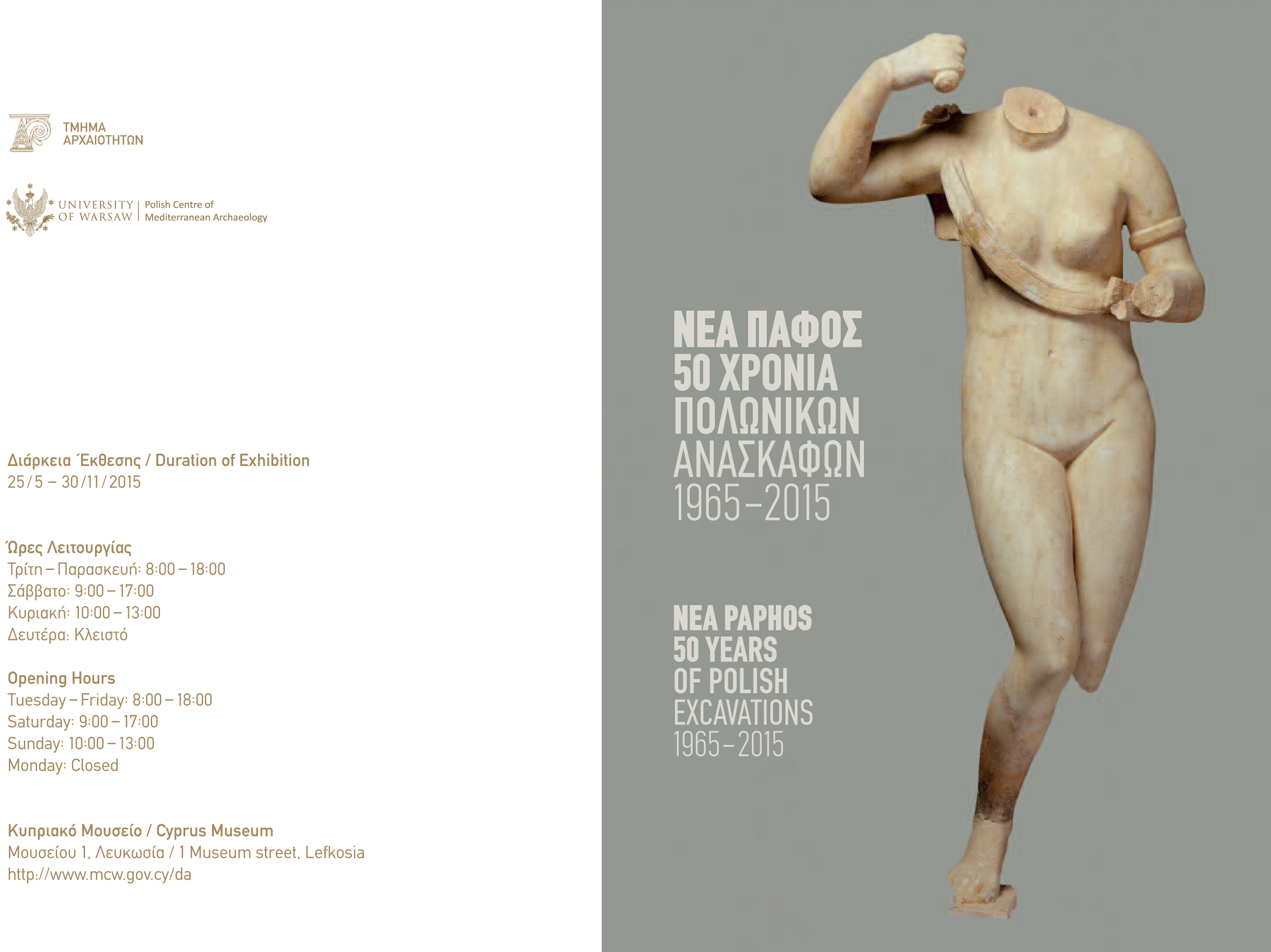 Το 2015 σηματοδοτεί την 50ή επέτειο της έναρξης των πολωνικών ανασκαφών στην Πάφο. Η έκθεση, που διοργανώθηκε από το Τμήμα Αρχαιοτήτων και το Κέντρο Μεσογειακών Σπουδών του Πανεπιστημίου της Βαρσοβίας, δίνει για πρώτη φορά την ευκαιρία στο κοινό να εξερευνήσει ένα μεγάλο μέρος των πορισμάτων μισού αιώνα αδιάκοπης αρχαιολογικής έρευνας στην πόλη της Πάφου. Οι ανασκαφές του Πανεπιστημίου της Βαρσοβίας στην αρχαία Νέα Πάφο (σημερινή Κάτω Πάφος), άρχισαν το 1965 με πρώτο διευθυντή τον καθηγητή Kazimierz Michałowski. Έκτοτε, οι ανασκαφές συνεχίζονται σε ετήσια βάση, με εξαίρεση το 1974, το έτος της τουρκικής εισβολής. Διευθυντής της πολωνικής αρχαιολογικής αποστολής υπήρξε για μακρά σειρά ετών (1966-2007), ο καθηγητής Wiktor Andrzej Daszewski και στη συνέχεια, μέχρι σήμερα, ο δρ. Henryk Meyza. Μια δεύτερη πολωνική αρχαιολογική αποστολή, από το Πανεπιστήμιο Jagiellonian της Κρακοβίας, ανέλαβε το 2011 την συνέχιση των ανασκαφών στο χώρο της ρωμαϊκής Αγοράς, υπό τη διεύθυνση της καθηγήτριας Ewdoksia Papuci-Władyka.