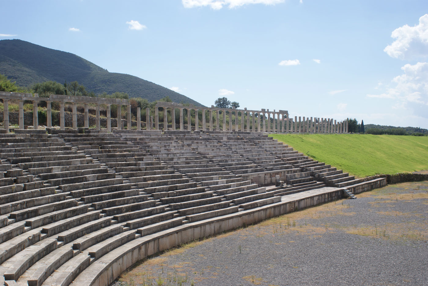 Περνώντας μέσα από αμπέλια και ελαιώνες, δεξιά βλέπουμε το χώρο του Θεάτρου της Αρχαίας Μεσσήνης με τους επιβλητικούς αναλημματικούς τοίχους.