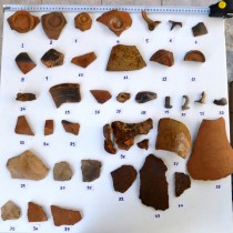 Αναλυτικά βρέθηκαν: βάση και τμήμα σώματος ανοιχτού αγγείου, μελανό εσωτερικά· βάση και τμήμα σώματος, γκριζομέλανο εσωτερικά· βάση και τμήμα σώματος κλειστού αγγείου· μυκτήρας και τμήμα σώματος λυχναριού· τμήμα από το σώμα δίχρωμου εξωτερικά ανοιχτού αγγείου (σκύφου), μελανό εσωτερικά· τμήμα από το χείλος και το σώμα δίχρωμου εξωτερικά, ανοιχτού αγγείου (σκύφου) με δύο αυλακώσεις κάτω από το χείλος, μελανό εσωτερικά· τμήμα από το σώμα αγγείου με ανάγλυφη διακόσμηση· τμήμα βάσης άβαφου πινακίου· τμήμα από το σώμα και τη βάση κλειστού αγγείου· λαβή και τμήμα σώματος λυχναριού· τμήμα χείλους και σώματος μελαμβαφούς πινακίου· τμήμα από το χείλος και το σώμα ανοιχτού ερυθροβαφούς αγγείου (σκύφου) με εγχάρακτη διακόσμηση· λαβή και τμήμα χείλους ερυθροβαφούς ανοιχτού αγγείου· τμήμα από το χείλος και το σώμα μελαμβαφούς σκύφου· τμήμα λαβής μελαμβαφούς αγγείου· τμήμα ταινιωτής λεπτής λαβής μελαμβαφούς αγγείου· τμήμα λαβής και σώματος από κύλικα κνιδιακού – κωακού τυπου· τμήμα από το σώμα μυροδοχείου μελανού εξωτερικά· τμήμα από το σώμα δίχρωμου εξωτερικά ανοιχτού αγγείου (σκύφου), μελανό εσωτερικά· τμήμα από το σώμα δίχρωμου εξωτερικά ανοιχτού αγγείου (σκύφου), μελανό εσωτερικά. Τα προαναφερθέντα αντικείμενα χρονολογούνται όλα στην Ελληνιστική περίοδο.