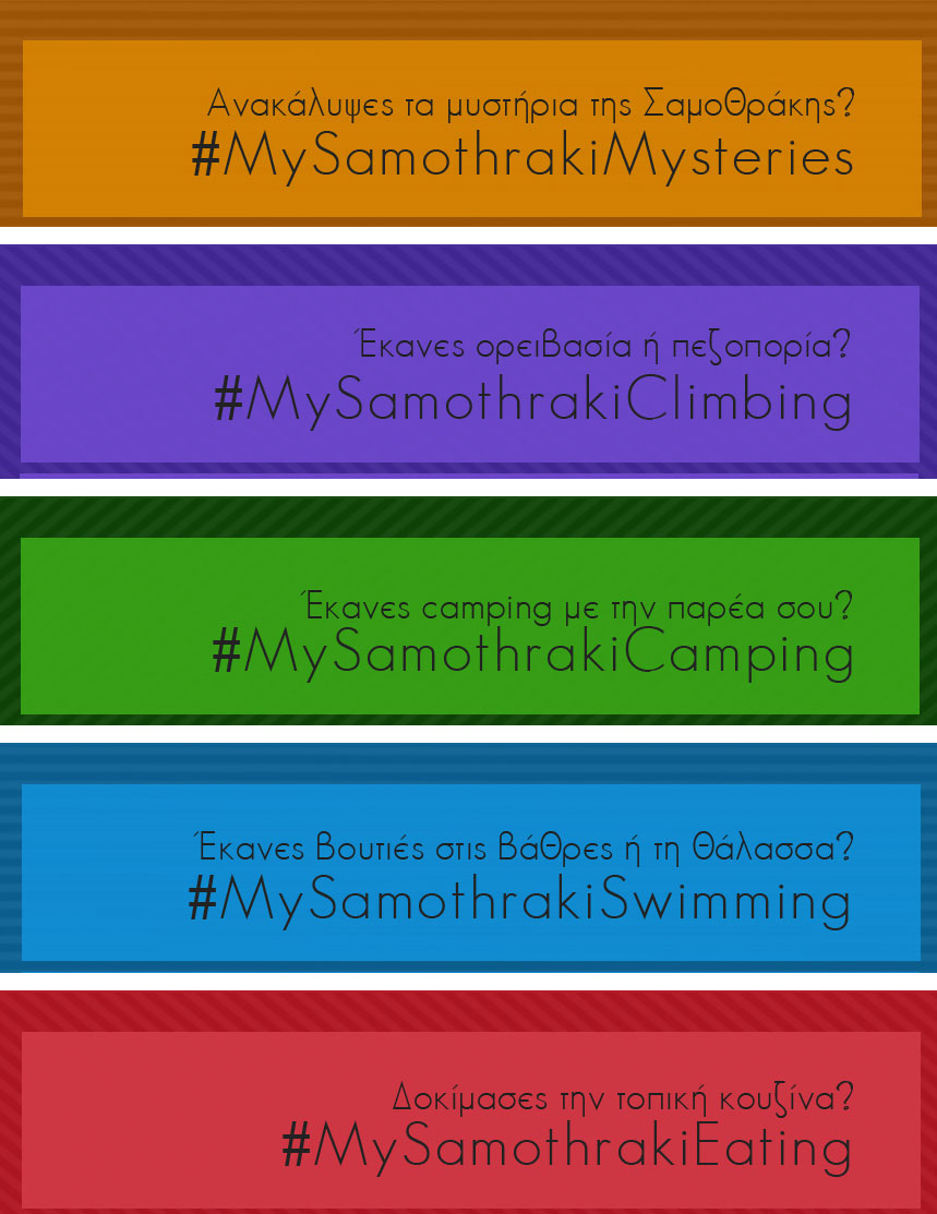 Έως τη Δευτέρα 30 Νοεμβρίου 2015 μπορείτε να ανεβάσετε φωτογραφίες στο Instagram με τις εμπειρίες σας χρησιμοποιώντας το hashtag #MySamothrakiExhibition και αυτό που τη χαρακτηρίζει περισσότερο από τις 5 κατηγορίες που ακολουθούν: