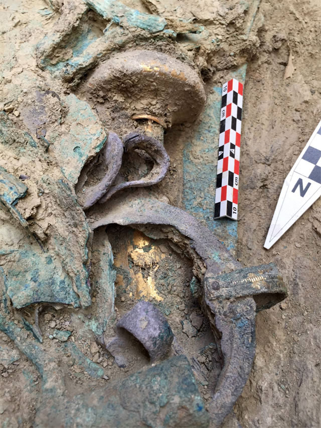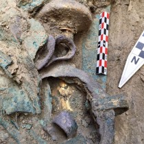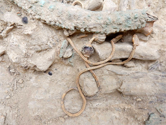 Χάλκινα: Επίμηκες ξίφος με ελεφαντοστέινη λαβή, επικαλυμμένη με χρυσό –σπάνια τεχνική που μιμείται την κεντητική– ήταν τοποθετημένο στο αριστερό στήθος του πολεμιστή. Ακριβώς από κάτω, βρέθηκε εγχειρίδιο με χρυσή λαβή παρόμοιας τεχνικής. Στα πόδια του νεκρού, βρέθηκαν χάλκινα όπλα, επίσης, χάλκινα αγγεία και κύπελλα, αμφορέας, πρόχοι και μία λεκανίδα.