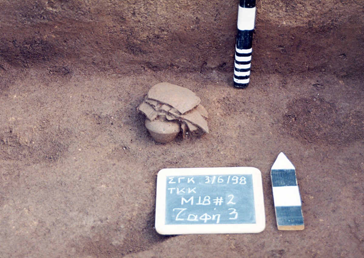 Ιδιαίτερο ενδιαφέρον εμφανίζουν η στρωματογραφία και τα ευρήματα κάτω από την ταφή. Το στρώμα στο οποίο ανοίχτηκε ο λάκκος για τον ενταφιασμό του νεκρού αποτελείται από πολύ σκληρή καστανόχρωμη επίχωση και πάρα πολλά ευρήματα (όστρακα, οστά ζώων, ένα κρανίο ζώου και αρκετά κομμάτια ψημένου πηλού από καμένο πασσαλόπηκτο κτίσμα) ανάμεσά τους και λίγα ανθρώπινα οστά. Στον πυθμένα του λάκκου, 25 εκατοστά κάτω από την ταφή, βρέθηκε μία ταφή σκύλου (σημ. 5). Ανάμεσα στις δύο ενότητες δεν μεσολαβεί στρώμα διάβρωσης, κάτι που υποδηλώνει μικρή χρονική απόσταση μεταξύ τους, ενώ δεν μπορούμε να γνωρίζουμε με βεβαιότητα την ακριβή σχέση των δύο ταφών (ζώου-ανθρώπου) και των στρωμάτων δίπλα και πάνω τους.