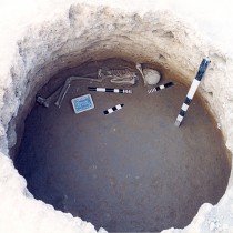 Ο σκελετός διατηρείται σε άριστη κατάσταση. Ανήκει σε παιδί 12 ετών (σημ. 4). Ο νεκρός (ή νεκρή) είχε ενταφιαστεί στο δυτικό όριο του λάκκου, κατά μήκος του καμπύλου τοιχώματός του, μέσα σε μικρό λάκκο που ανοίχτηκε στην προϋπάρχουσα επίχωση, με παράλληλη διεύρυνση του λάκκου προς τα δυτικά. Τοποθετήθηκε σε ελαφρώς συνεσταλμένη στάση και προς τα δεξιά του, με προσανατολισμό βόρεια-νότια, με το κεφάλι στα βόρεια. Το μήκος του σκελετού είναι 1,35μ., ενώ λείπουν το πέλμα του αριστερού ποδιού και τμήματα των χεριών, όπου δείχνει ελαφρώς διαταραγμένος. Η ταφή καλύφθηκε με στρώμα πάχους 0,25μ. από καστανόγκριζο χώμα, με υπολείμματα καύσης και πάρα πολλά ευρήματα (όστρακα, οστά ζώων και πολλά μικροευρήματα), ανάμεσά τους και λίγα ανθρώπινα οστά. Κάτω ακριβώς από αυτήν, βρέθηκαν δύο τμήματα κοσμημάτων (δύο δακτύλιοι από σπονδύλο).