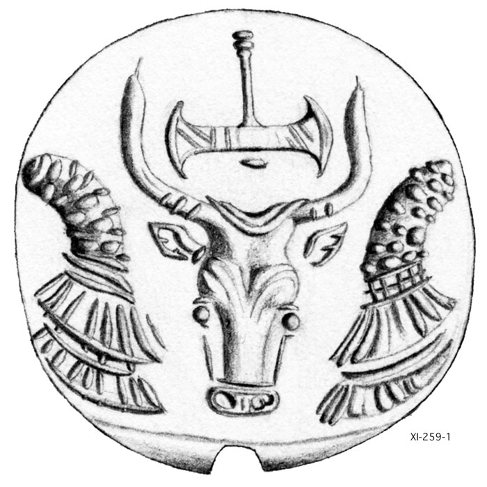 Όπως αναφέρει χαρακτηριστικά: «Πολύ συχνά, απεικονίζεται μόνο το κεφάλι του ζώου και, ειδικότερα, δίδεται έμφαση στα κέρατα. Τα εικονογραφικά στοιχεία φαίνεται να υποδηλώνουν ότι υπήρχε μια ιδιαίτερη σχέση ανάμεσα στον διπλό πέλεκυ και τα κέρατα των βοοειδών. Η χρήση των διαφόρων τύπων πελέκεων για τη σχηματική απεικόνιση των κεράτων των βοοειδών ήταν, κατά τους προϊστορικούς χρόνους, ευρέως διαδεδομένη στην ανατολική Αφρική, καθώς επίσης και την Αίγυπτο. Η συγκεκριμένη πρακτική φαίνεται πως εντοπίζεται και στην Κρήτη κατά την Εποχή του Χαλκού και σχετίζεται με την κατανόηση της συμβολικής σημασίας του διπλού πελέκεως».