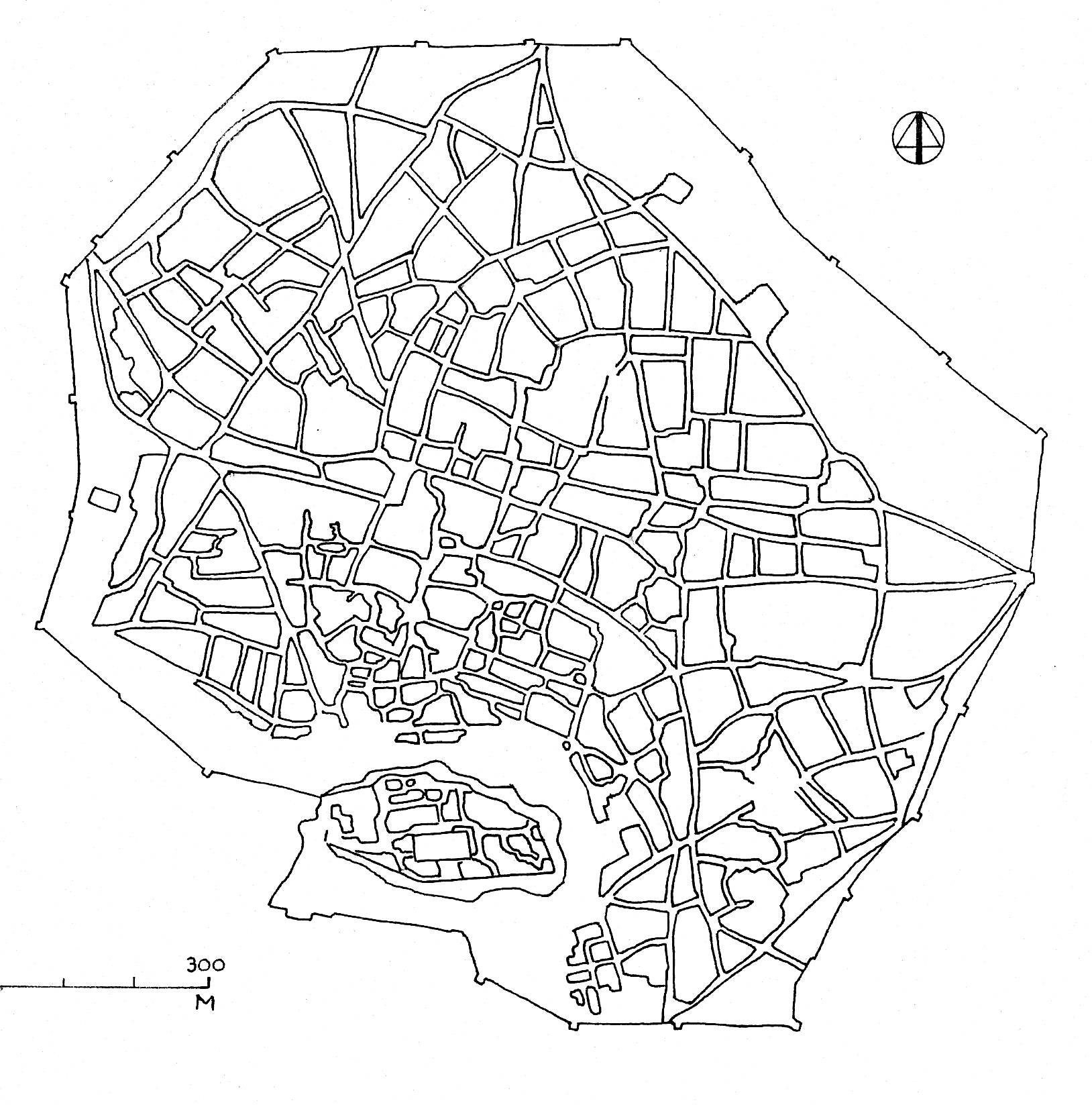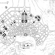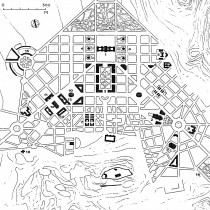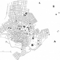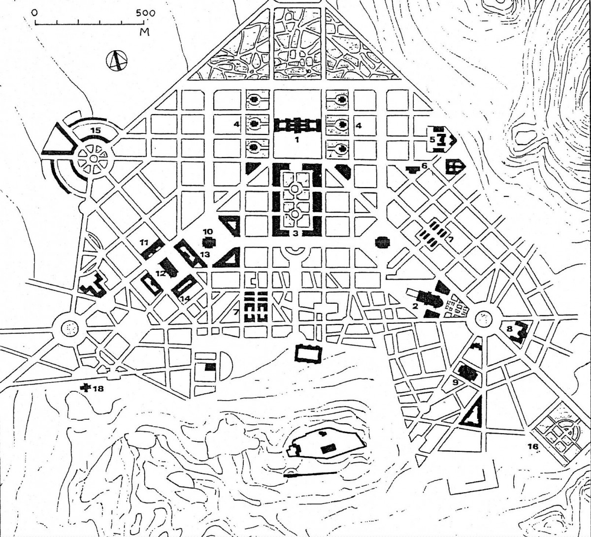 Εικ. 3: 1. Ανάκτορα 2. Μητρόπολη 3. Κεντρική Αγορά 4. Ακαδημία 5. Βιβλιοθήκη 6. Πανεπιστήμιο 7. Μέγαρο Εκθέσεων 8. Υπουργεία 9. Γερουσία 10. Βουλή 11. Στρατόπεδο 12. Ναός 13. Ταχυδρομείο 14. Φυλακή και Αστυνομία 15. Θέατρο 16. Αγορές 17. Επισκοπή 18. Σχολεία.