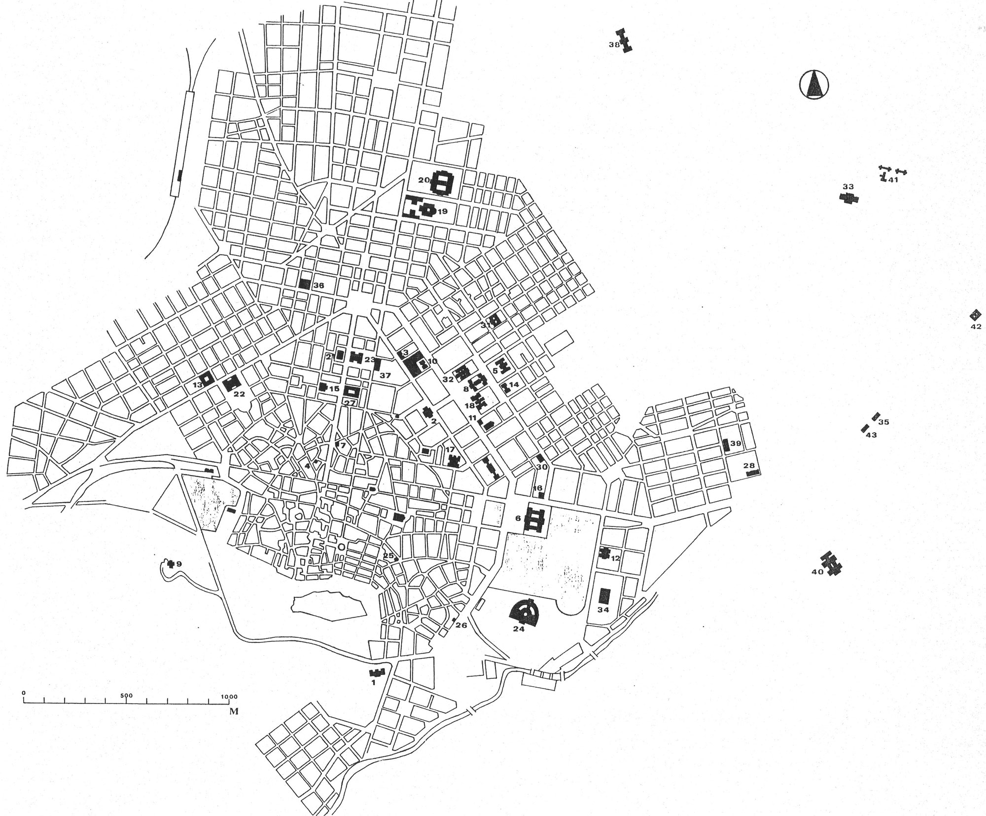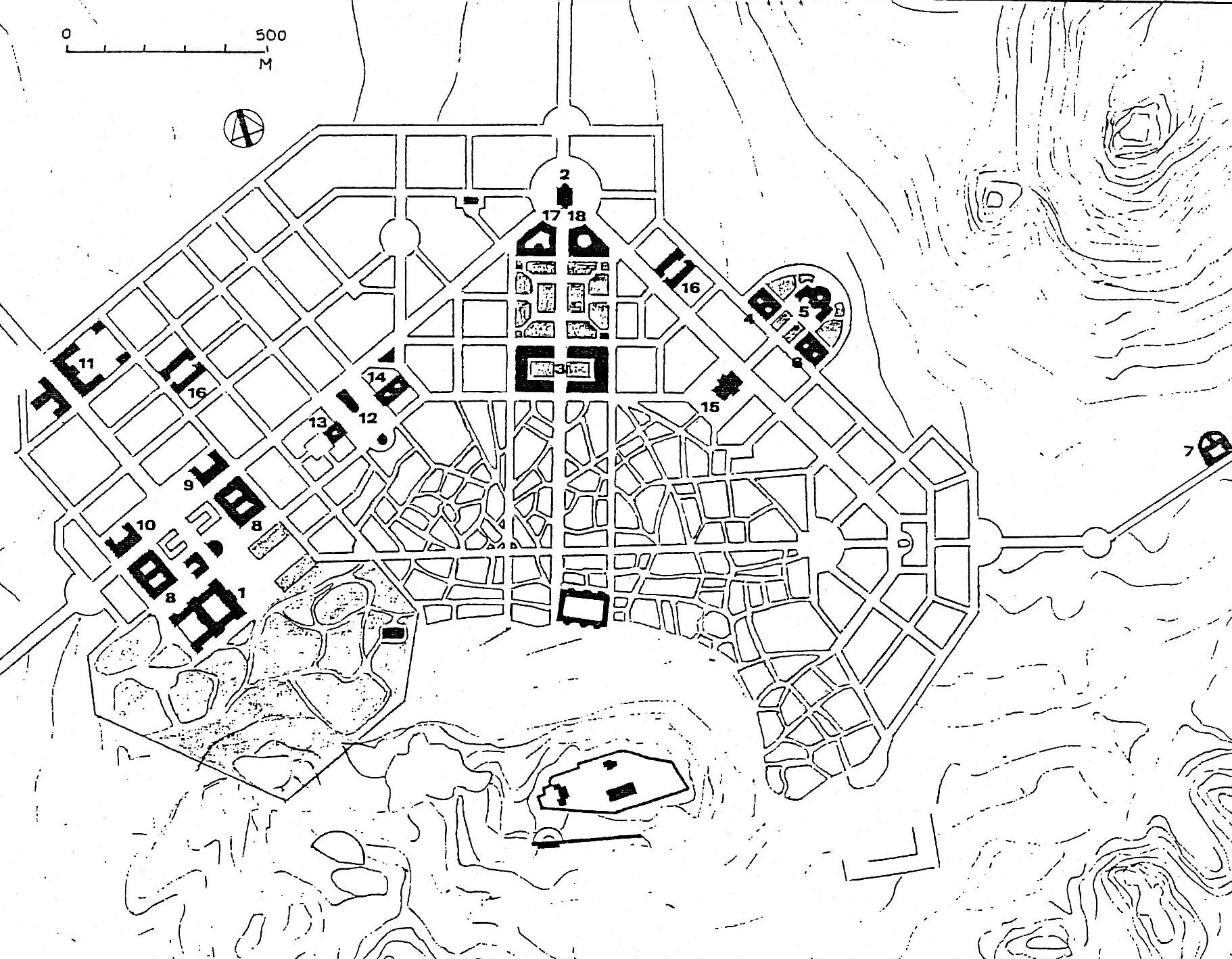 Εικ. 2: 1. Ανάκτορα 2. Μητρόπολη 3. Κεντρική Αγορά 4. Υπουργεία 5. Φρουρά 6. Νομισματοκοπείο 7. Αγορά 8. Ακαδημία 9. Βιβλιοθήκη 10. Χρηματιστήριο 11. Βουλή 12. Ναός 13. Ταχυδρομείο 14. Αρχηγείο 15. Ελαιοτριβείο 16. Βοτανικός Κήπος 17. Μέγαρο Εκθέσεων 18. Αστεροσκοπείο.