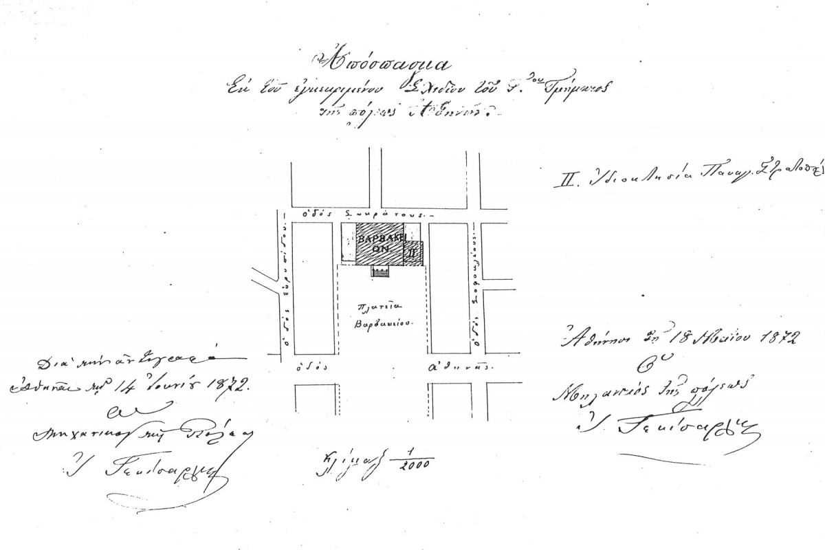 Εξάλλου, δεν λείπουν και αυτή την εποχή οι προσπάθειες για τη δημιουργία του απαραίτητου ελεύθερου περιβάλλοντα χώρου, την ύπαρξη του οποίου επιβάλλουν λόγοι τόσο αισθητικοί όσο και λειτουργικοί. Αυτή την περίοδο, η επιθυμία για τη δημιουργία ελεύθερων χώρων και χώρων πρασίνου σε συνάρτηση με τα δημόσια κτήρια είχε ενταθεί, λόγω της επικράτησης των νέων αντιλήψεων και προτύπων της αστικής ζωής που επέβαλλαν τη δημιουργία ανοικτών χώρων αναψυχής και περιπάτου. Αυτοί οι χώροι, όμως, μπόρεσαν να δημιουργηθούν κυρίως έξω από την πόλη, όπου τα οικόπεδα ήταν πολύ φθηνότερα. Έτσι, δεν μπόρεσαν συνήθως να συνδυαστούν με τα δημόσια κτήρια, τα οποία, βέβαια, βρίσκονταν σε κεντρικότερες θέσεις. Ένα παράδειγμα έχουμε και με την περίπτωση του Βαρβακείου. Ο ιδιοκτήτης οικίσκου κοντά στο Βαρβάκειο (εικ. 6), με έγγραφό του προτείνει την παραχώρηση του στο ίδρυμα, έναντι αποζημιώσεως, γιατί είναι σε αυτόν άχρηστος (Σ.Σ. χαρακτηρίστηκε ετοιμόρροπος), ενώ στο σχολείο θα φανεί πολύ χρήσιμος, ως «αυλή γυμναστήριος» με την πρόσληψη και μερικών άλλων τεμαχίων (σημ. 39). Επίσης, όπως πληροφορούμαστε από αναφορά του μηχανικού της πόλης προς το Υπουργείο Εσωτερικών, έγινε μία μεταρρύθμιση, με την οποία παραχωρήθηκε στο Βαρβάκειο μία παρακείμενη ιδιοκτησία για να χρησιμεύσει ως κήπος του σχολείου (σημ. 40).