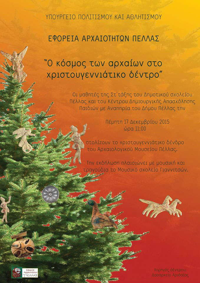 Ειδικότερα, την Πέμπτη 17 Δεκεμβρίου 2015, και ώρα 11.00, θα πραγματοποιηθεί εκδήλωση με τίτλο «Ο κόσμος των αρχαίων στο χριστουγεννιάτικο δέντρο». Στη διάρκεια της εκδήλωσης μαθητές της Στ΄ Τάξης του Δημοτικού Σχολείου Πέλλας και του Κέντρου Δημιουργικής Απασχόλησης Παιδιών με Αναπηρία του Δήμου Πέλλας θα στολίσουν το χριστουγεννιάτικο δέντρο του Μουσείου με αντίγραφα ευρημάτων, τα οποία θα κατασκευάσουν οι ίδιοι, στέλνοντας τις δικές τους ευχές για τα φετινά Χριστούγεννα. Την εκδήλωση θα πλαισιώσει με μουσική και τραγούδια το Μουσικό Σχολείο Γιαννιτσών.