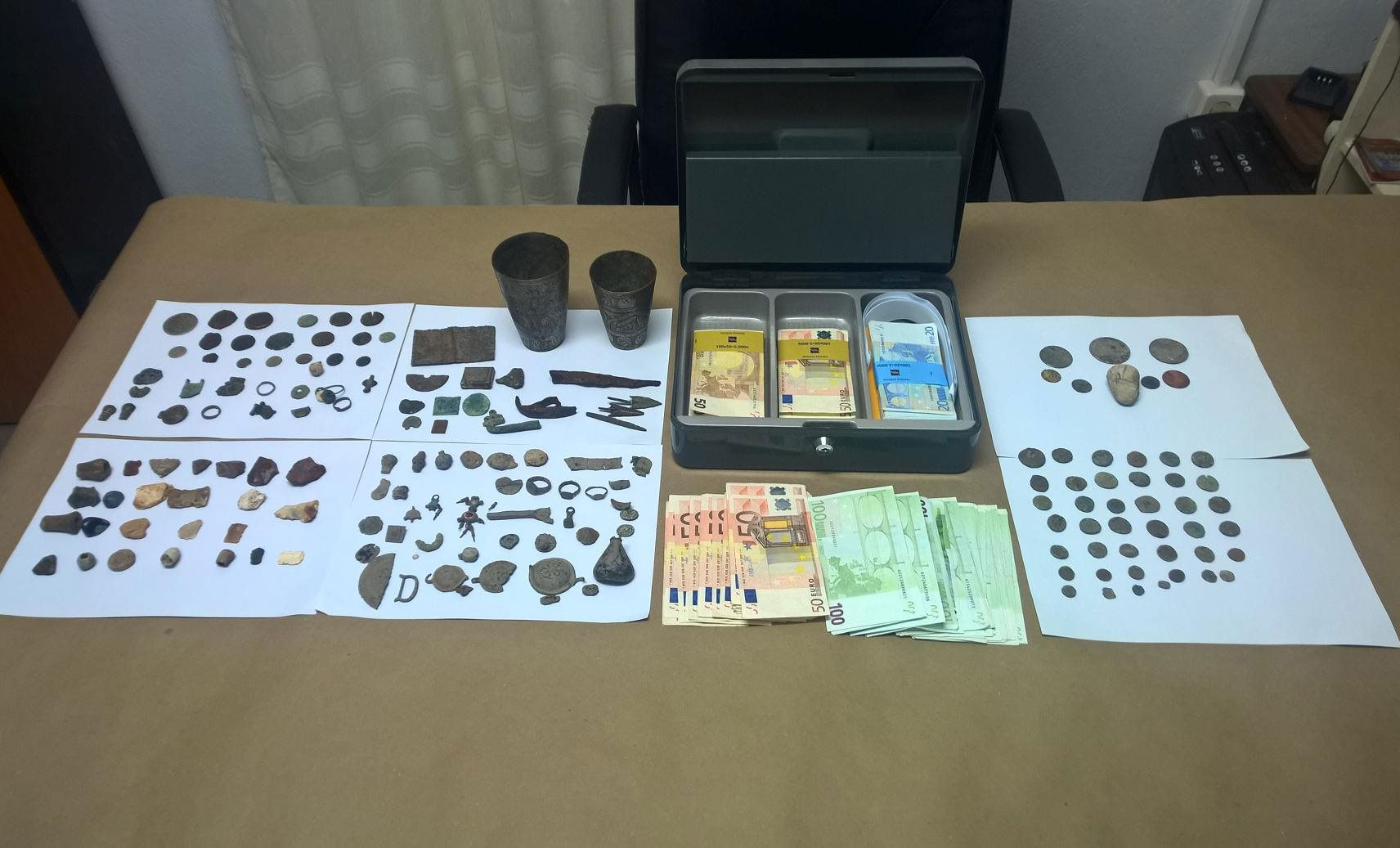 Σε έρευνες που διενεργήθηκαν στις οικίες και τις αποθήκες των τριών ανδρών, βρέθηκαν και κατασχέθηκαν, μεταξύ άλλων: 66 αρχαία νομίσματα, 25 αρχαία κοσμήματα καθώς και πλήθος μεταλλικών και λίθινων αντικειμένων και εργαλείων.
