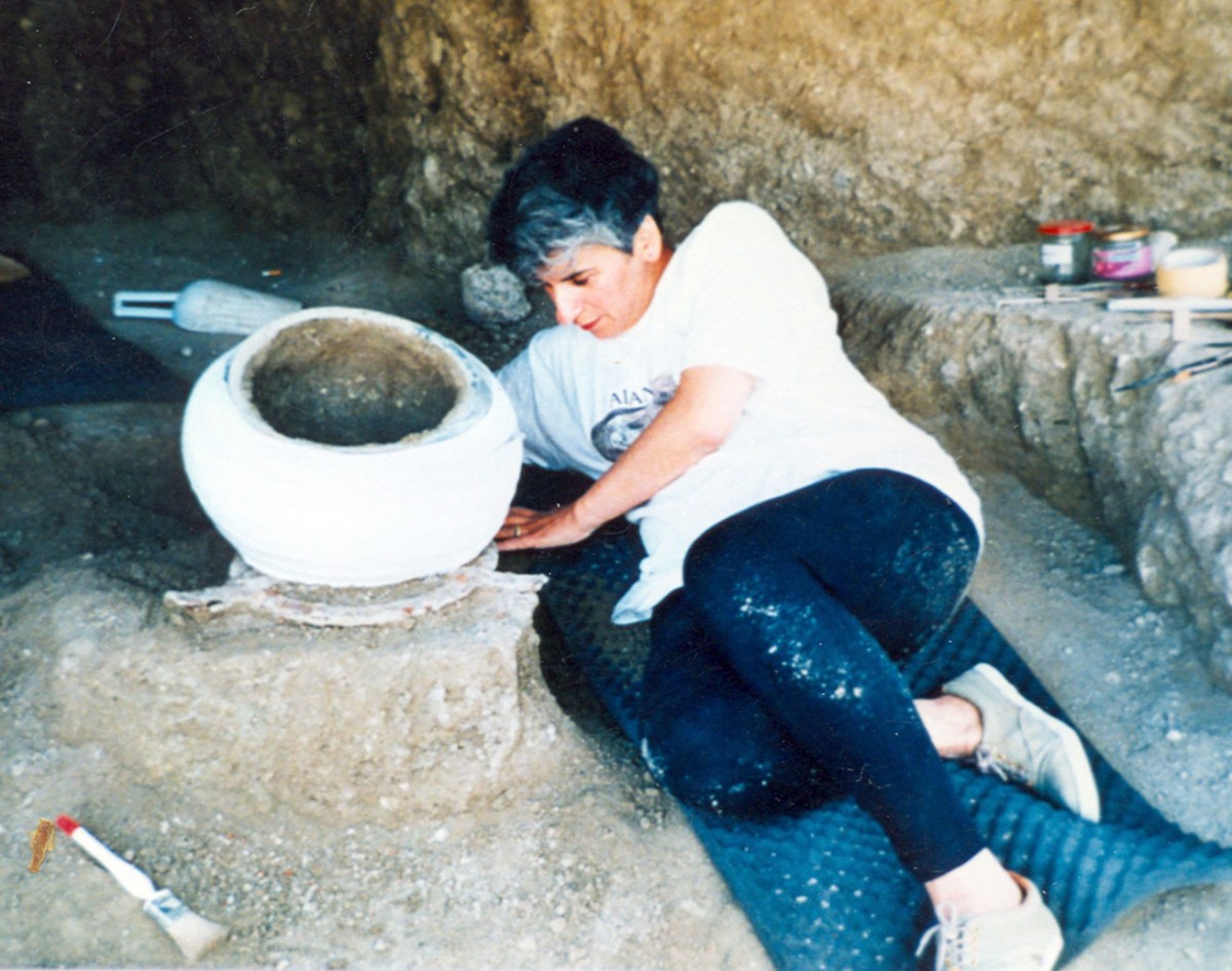 Λοιπόν, η Γεωργία είναι ένας πολύ σοβαρός άνθρωπος, ο πιο εργατικός άνθρωπος που έχω γνωρίσει, προσηλωμένη στο έργο της, με ευρύτητα πνεύματος. Συνέβη το εξής: Εγώ πήγα εκεί και συγκινήθηκα από τον τιτάνιο αγώνα της Γεωργίας να αναδείξει το χώρο, να φτιάξει Μουσείο, να ανασκάψει, να μελετήσει τα ευρήματα και να μεταδώσει τη γνώση αυτή στο κοινό δημοσιεύοντάς τα. Συγκινήθηκα γιατί δεν πήγαινε εύκολα κανείς τόσο μακριά. Ήταν ένας τόσο σημαντικός αρχαιολογικός χώρος, αλλά δεν βρισκόταν στον κεντρικό άξονα Αθήνας-Θεσσαλονίκης και θεωρείτο «άγονη γραμμή», να το πούμε έτσι. «Δεν πίστευα ότι θα ’ρθεις ποτέ» μου είπε. Πήγα το πρώτο καλοκαίρι με τρεις φοιτητές από τα ΤΕΙ, φτιάξαμε ομάδα εργασίας κι αρχίσαμε να συντηρούμε. Στην αρχή πήγαινα μόνο τα καλοκαίρια αλλά μετά χρειαζόταν να πηγαίνω κατά διαστήματα και στη διάρκεια του χρόνου. Εγώ ευχαριστώ τη Γεωργία -η ίδια λέει ότι νιώθει υποχρεωμένη που πήγα εκεί- εγώ νιώθω ότι μου χάρισε πάρα πολύ δημιουργικές στιγμές, επειδή ήμουν δημιουργική και χαρούμενη με τη συνεργασία και δεν υπολόγιζα τη διαδρομή. Πήγαινα με όλα τα μέσα και με οποιονδήποτε καιρό, ακόμη και με χιόνια: Με λεωφορεία, με τ’ αυτοκίνητό μου που ήταν πολύ κουραστικό. Ακόμη και με το σπάνιο και επίφοβο μικρό αεροπλάνο πότε-πότε. Μου έλεγε, ας πούμε: «Έλα, βρήκαμε μυκηναϊκό ξίφος. Έλα να το βγάλεις από την ανασκαφή». Κι εγώ δεν σκεφτόμουνα τίποτα, έπαιρνα το αυτοκίνητο και πήγαινα.
