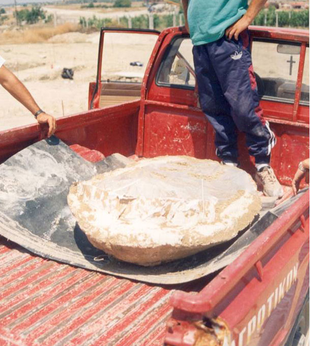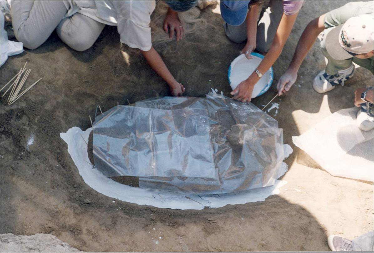 Μ.Λ.-Π.: Όχι μόνο. Δηλαδή, αφήνοντας ένα μέρος χώματος γύρω από το αντικείμενο, σκάβουμε περιμετρικά, γύρω-γύρω και προς τα κάτω, ένα χαντάκι. Εκεί μέσα ρίχνουμε γύψο, ενισχυμένο και με άλλα υλικά, και μετά όταν ξηραίνεται αυτό το σηκώνουμε με απόλυτη ασφάλεια ολόκληρο, το πάμε στο εργαστήριο κι εκεί, σιγά-σιγά, το αποκαλύπτουμε με προσοχή. Αυτό όταν έχουμε πολύ λίγο χρόνο και πρέπει γρήγορα να το σηκώσουμε απ’ την ανασκαφή, γιατί ο γύψος στερεοποιείται γρήγορα. Αν έχουμε περισσότερο χρόνο, χρησιμοποιούμε πολυουρεθάνη, η οποία όταν ξηραίνεται είναι ελαφρύ υλικό και έτσι εξυπηρετεί καλύτερα την ανάσυρση από το χώμα. Επίσης τα αντικείμενα είναι φαινομενικά ακέραια όταν τα βρίσκουμε αλλά συνήθως είναι σπασμένα σε άπειρα κομμάτια, απλώς τα συγκρατεί το χώμα στη θέση τους. Ενισχύουμε λοιπόν με γάζες και τυλίγουμε με ελαστικούς επιδέσμους το αντικείμενο για να το σηκώσουμε με ασφάλεια. Αυτές είναι μερικές από τις μεθόδους που χρησιμοποιούμε και που είδατε στις εικόνες.