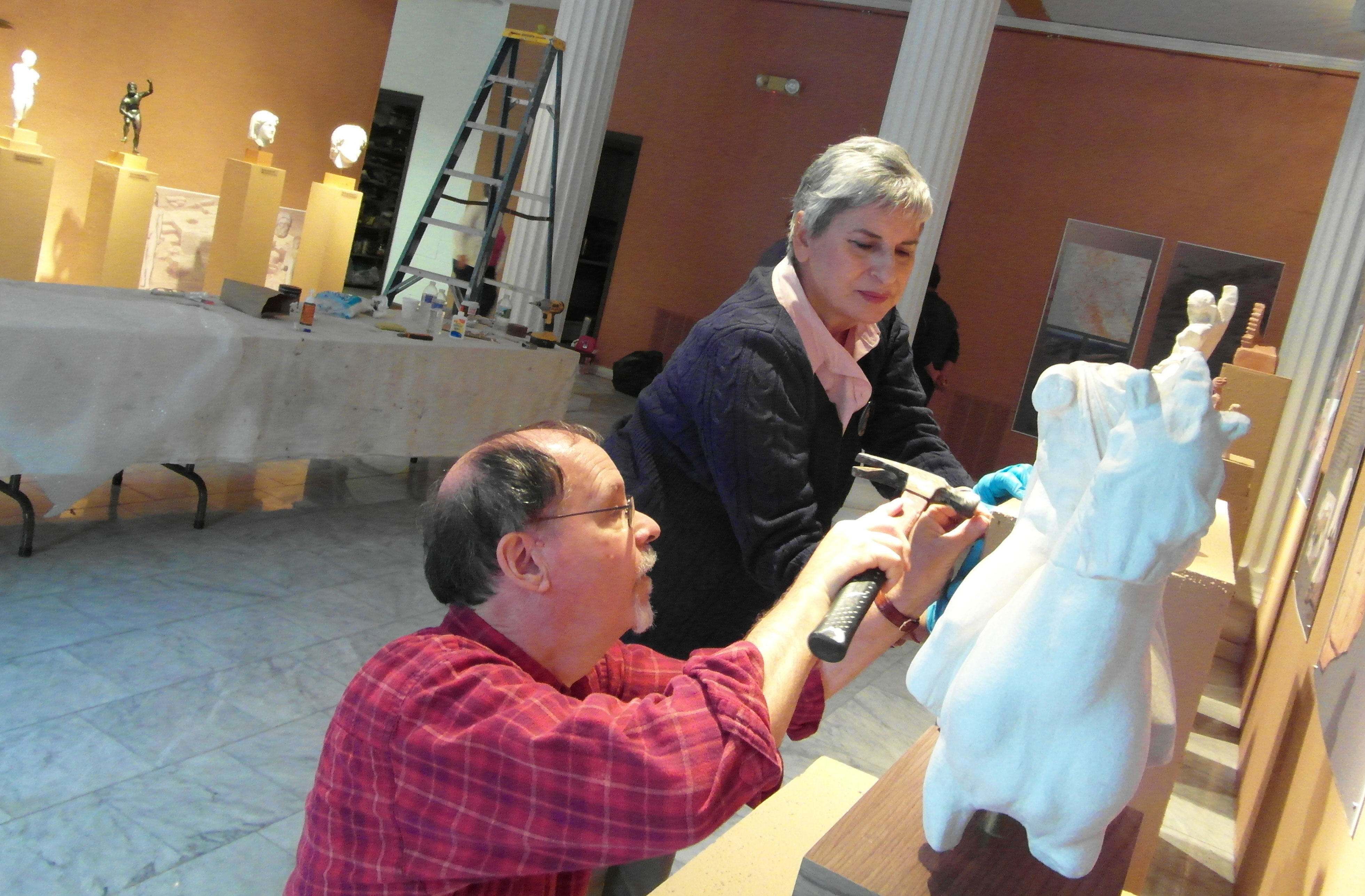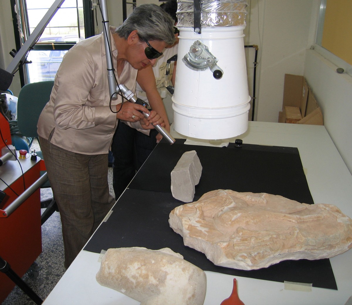 Μ.Λ.-Π.: Στην περίπτωσή μας, των γλυπτών του Μουσείου είχαμε επικαθήσεις αλάτων. Θα πρέπει να πούμε ότι τα λέιζερ είναι η εξέλιξη και είναι η πιο ακίνδυνη μέθοδος για τον καθαρισμό της πέτρας αλλά, βέβαια, πάντα σε συνεργασία με το ΙΤΕ της Κρήτης, το Ινστιτούτο Ηλεκτρονικής Δομής και Λέιζερ, διότι αυτοί κάνουν τις έρευνες, αυτοί μας δίνουν τις σωστές οδηγίες, που είναι αποτέλεσμα των ερευνών τους, για την ακτίνα και πόσο μπορεί να προχωρήσει στο συγκεκριμένο υλικό. Οι έρευνες τους έχουν επεκταθεί και σε άλλα υλικά. Συγκεκριμένα εμείς συνεργαστήκαμε με τη φυσικό Βιβή Πουλή, ερευνήτρια που έχει ασχοληθεί με το θέμα κι έχει δημοσιεύσει πολλές εργασίες. Διευθυντής είναι ο Κώστας Φωτάκης. Στην αρχή πήγα στην Κρήτη, πήγα εκεί με μικρά δείγματα, κάναμε αρκετές δοκιμές και βρήκαμε ακριβώς τις κατάλληλες συνθήκες, τις παραμέτρους που πρέπει να χρησιμοποιήσουμε. Δανειστήκαμε το μηχάνημα από κει. Τώρα όμως, με τα χρήματα του ΕΣΠΑ, αγοράστηκε ένα τέτοιο μηχάνημα στο Μουσείο της Αιανής.