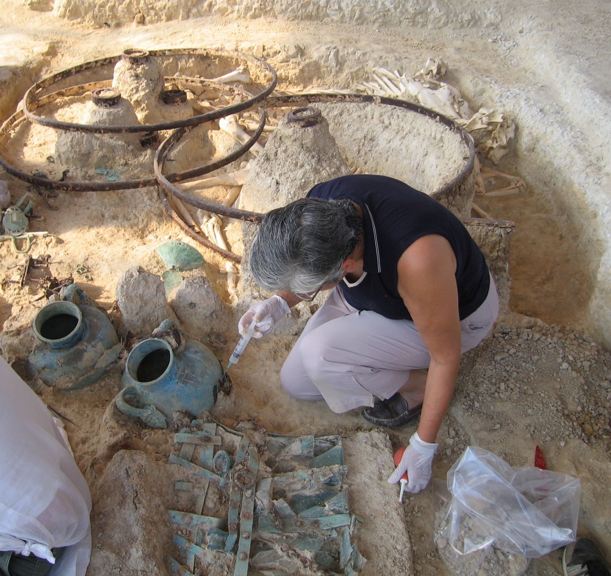 Τώρα, γράφοντας για τις εργασίες συντήρησης στην Αιανή («The Conservation Project at Aiani Archaeological Museum», στο Το Αρχαιολογικό Έργο στην Άνω Μακεδονία, 2, 2011, Αιανή 2013), αναφέρεστε αρχικά στη συντήρηση πεδίου, την ώρα της ανασκαφής δηλαδή. Εντυπωσιάστηκα από τις φωτογραφίες που αποτυπώνουν τις τεχνικές σας: πώς ανασύρετε ένα σκελετό σαν σε λίκνο, πώς «φασκιώνετε» έναν πίθο.