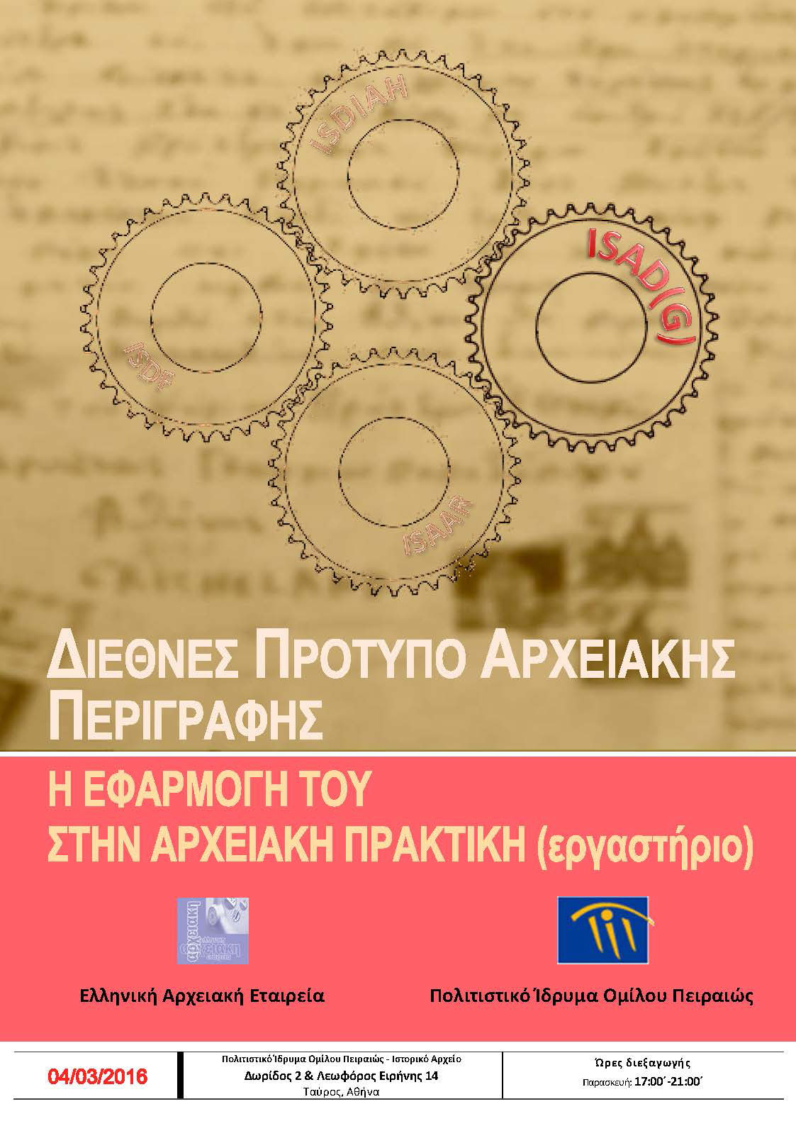 Το Πολιτιστικό Ίδρυμα Ομίλου Πειραιώς (ΠΙΟΠ) και η Ελληνική Αρχειακή Εταιρεία (ΕΑΕ) διοργανώνουν Εργαστήριο Αρχειακών Προτύπων με αντικείμενο το Διεθνές Πρότυπο Αρχειακής Περιγραφής (ΔΙΠΑΠ), την Παρασκευή 4 Μαρτίου (17:00-21:00), στον χώρο του Ιστορικού Αρχείου ΠΙΟΠ, στον Ταύρο (Δωρίδος 2 και Λεωφόρος Ειρήνης 14).