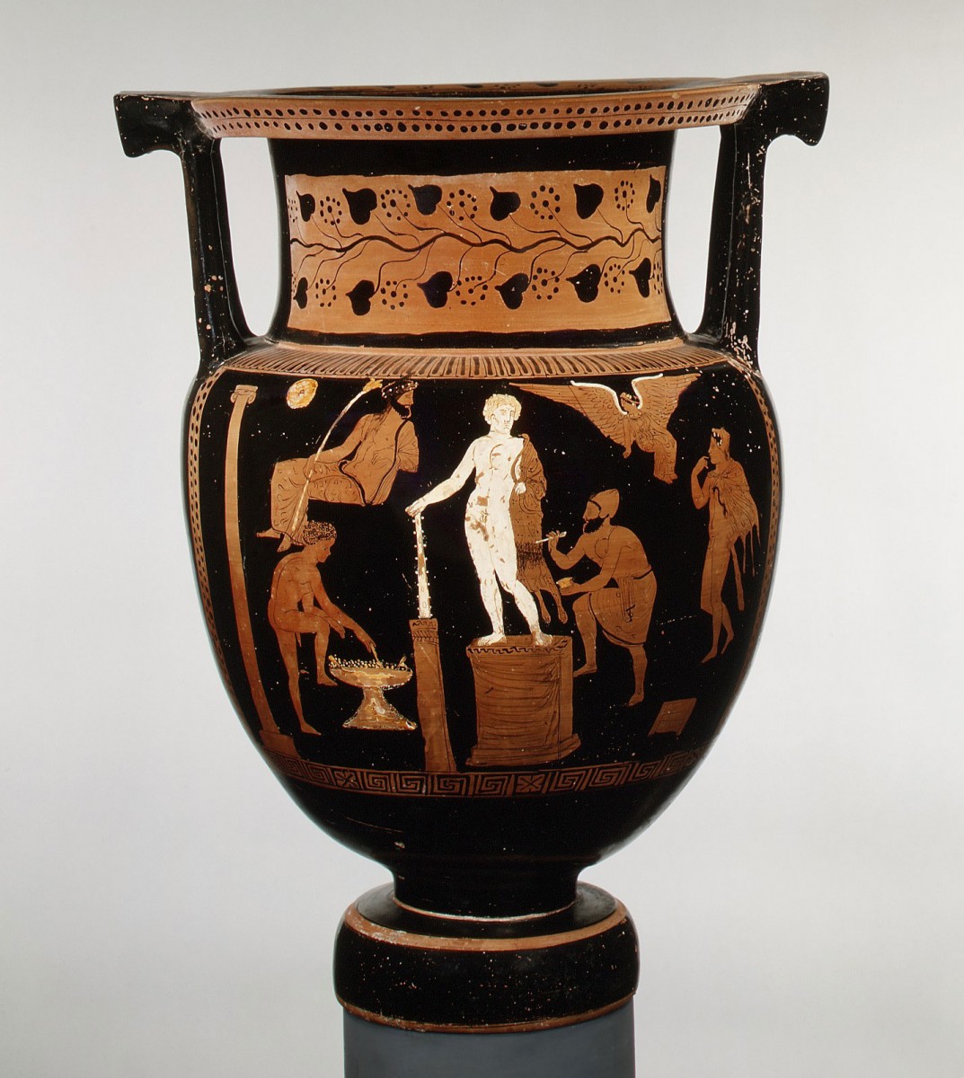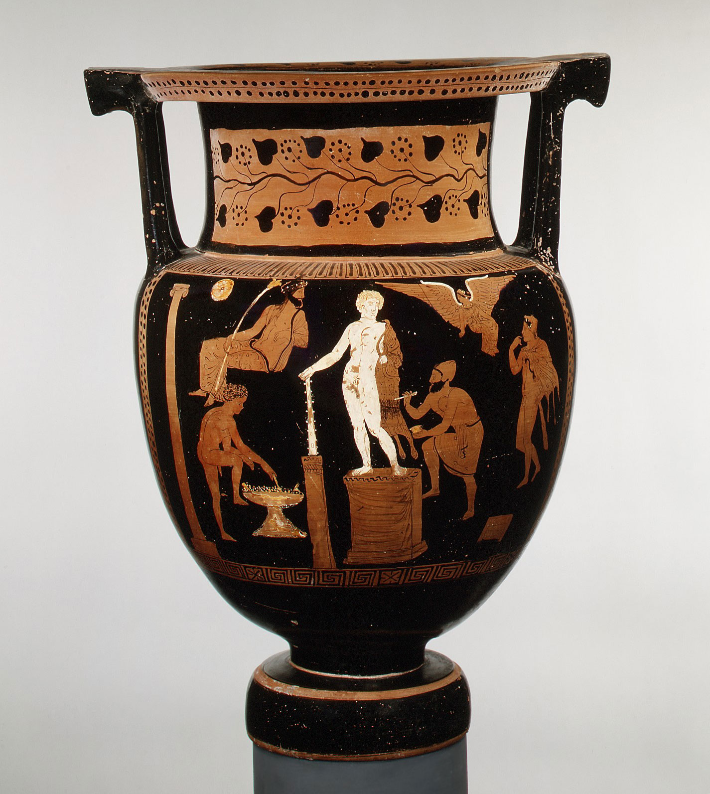 Τι κάνει, όμως, τόσο ξεχωριστό το συγκεκριμένο αγγείο; Μεταξύ άλλων, η μοναδική παράσταση της, χαμένης σήμερα, τεχνικής διακόσμησης μαρμάρινων γλυπτών με την τεχνική της εγκαυστικής στην εμπρόσθια όψη του: Ένας τεχνίτης με τον βοηθό του διακοσμεί ένα άγαλμα του Ηρακλή, σκηνή που διαδραματίζεται σε εσωτερικό χώρο –όπως δηλώνει ο κίονας αριστερά– και στην οποία παρίστανται επίσης ο Δίας, πατέρας του Ηρακλή, μία Νίκη και στο δεξιό άκρο ο ίδιος ο αποθεωμένος Ηρακλής, που παρακολουθεί τον στολισμό του αγάλματός του. Στην οπίσθια όψη απεικονίζεται η Αθηνά, προστάτιδα του Ηρακλή, να συνομιλεί καθισμένη με έναν από τους Διόσκουρους, παρουσία του Ερμή, του Πάνα και ενός Έρωτα που παίζει με πτηνό.
